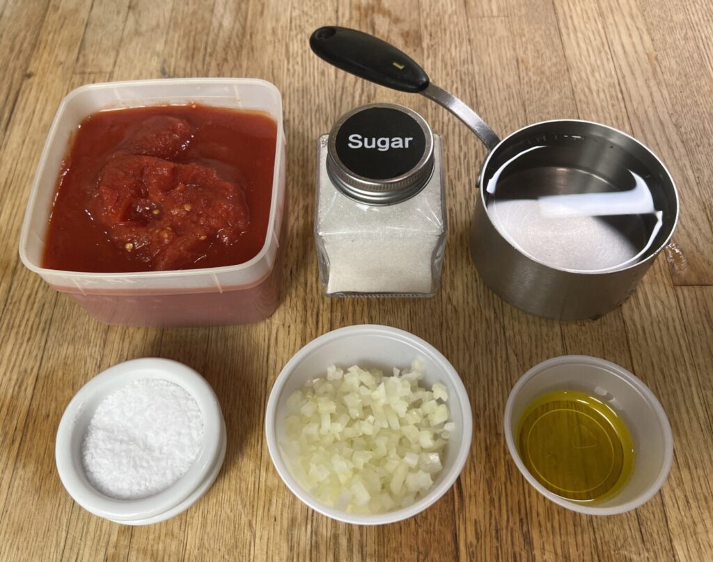 Your first task is to make the winter tomato sauce. Here are the ingredients you need at the stove: