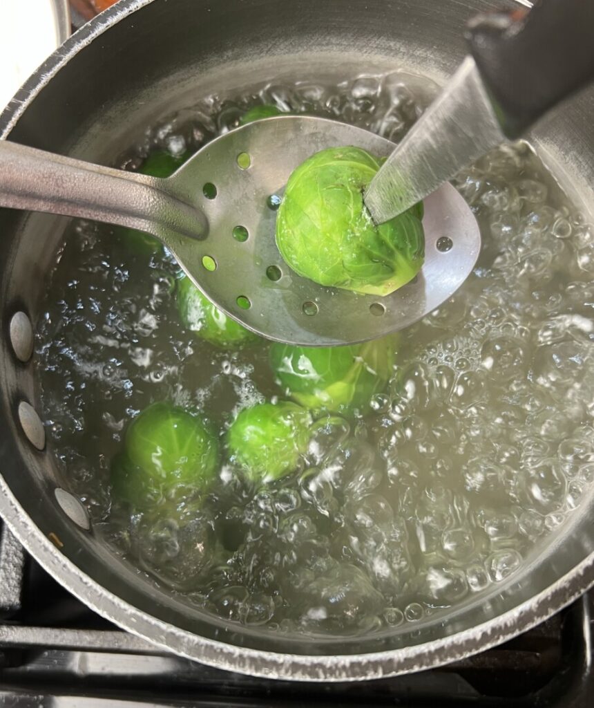 - Immerse the sprouts in the boiling water. Cook for about 4 minutes for small-to-medium-sized sprouts, and about 7 minutes for large ones. When the sprouts are sufficiently par-cooked, the tip of a paring knife should meet just a little resistance when pushed into a test sprout.