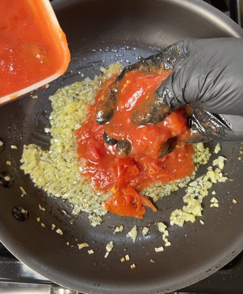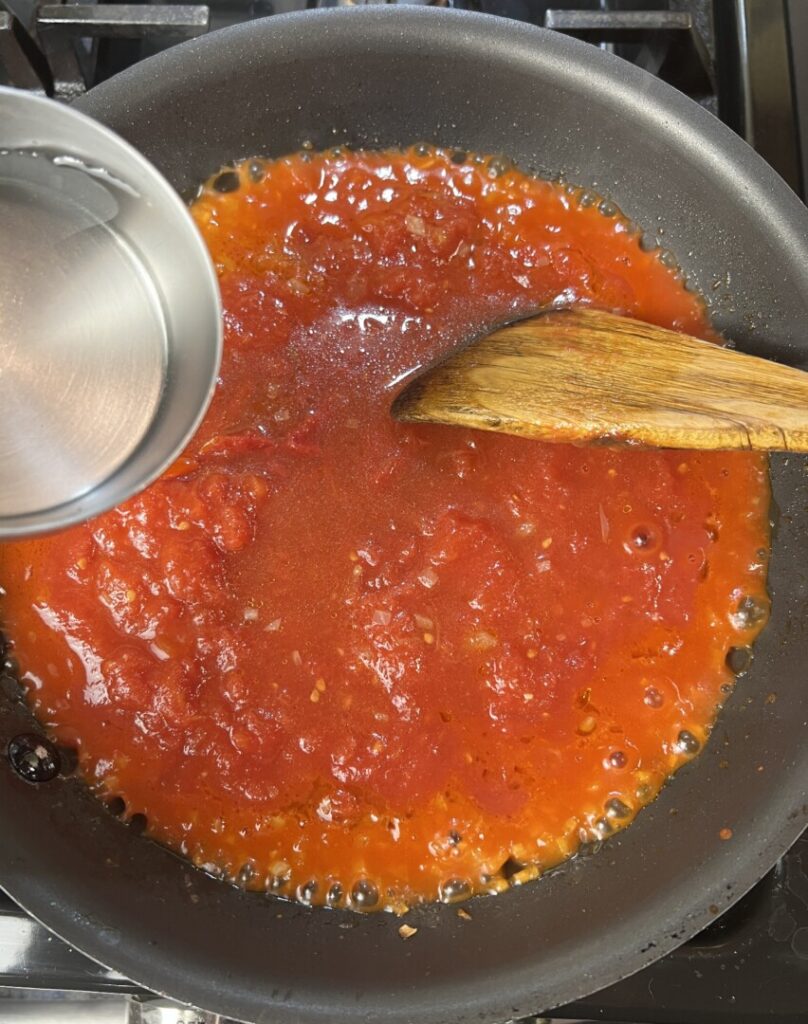 - Add the tomatoes to the pan, crushing each one in your hand as you add it. Then add the juice or purée surrounding the tomatoes. Add between ½ and 1 c water, depending on the consistency of the tomatoes. Add some salt and the sugar.