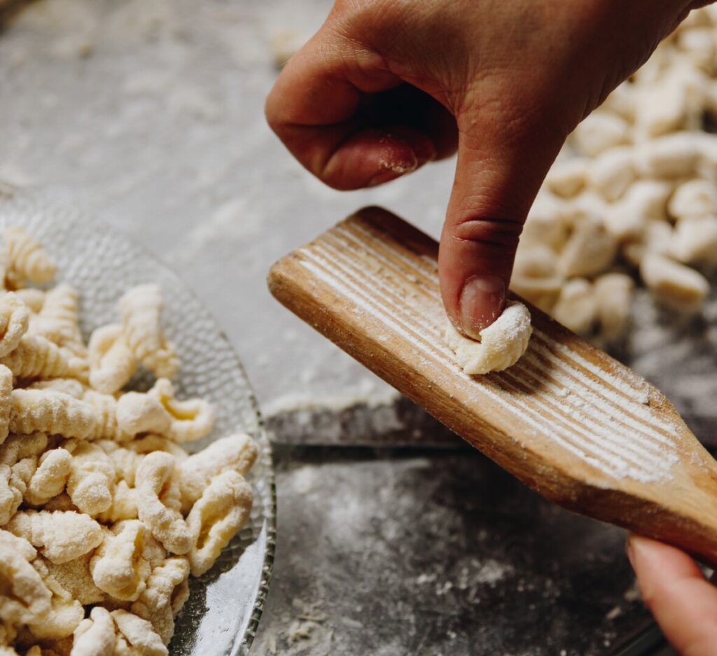 Gnocchi is the Italian term for unfilled dumplings, which are considered a type of pasta. Although there are hundreds of gnocchi variations in Italy, they can be divided into three main categories by type: potato gnocchi, semolina gnocchi, and ricotta gnocchi. In Italy, making handmade gnocchi is considered an art; mastering it requires time, attention, and patience. Thus, handmade gnocchi is a special-occasion food best showcased by simply boiling and dressing with a simple sauce. Enjoying plateful of plump, tender, light-as-air gnocchi tossed with a fresh tomato sugo, or simply with butter and aged Parmigiano-Reggiano cheese, is one of life’s great pleasures.