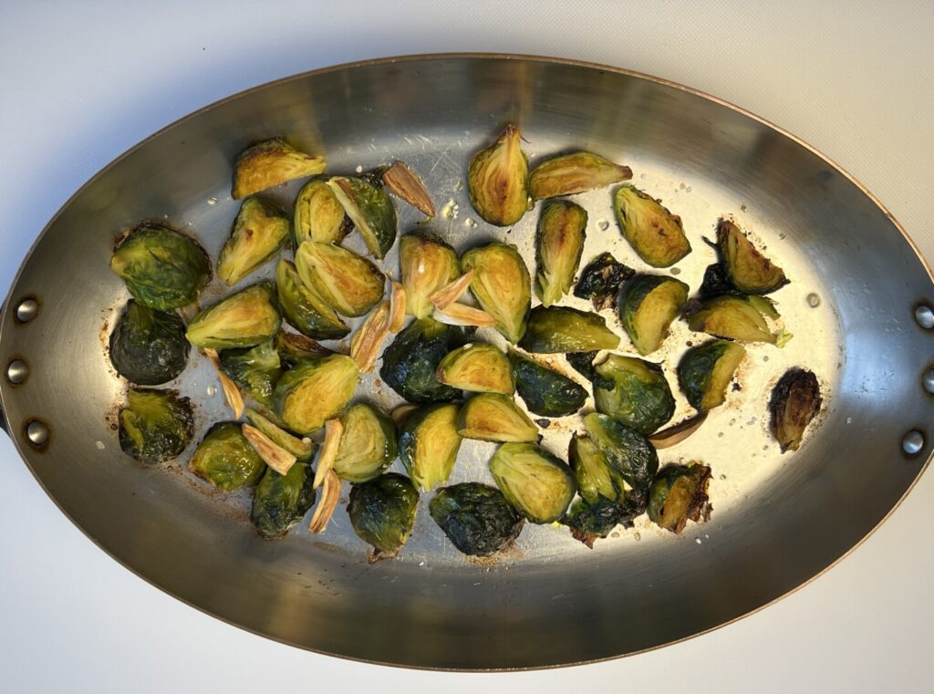 - Place the baking dish in the oven and roast for about 15 minutes until the sprouts and garlic are golden brown and the sprouts are crispy at the edges.