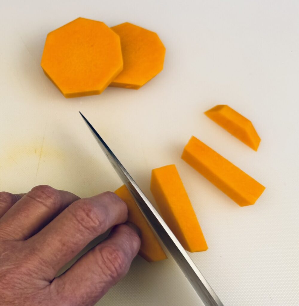 If you’re using pre-cut, packaged squash cubes, check each piece and trim off any stringy pulp overlooked during processing.
