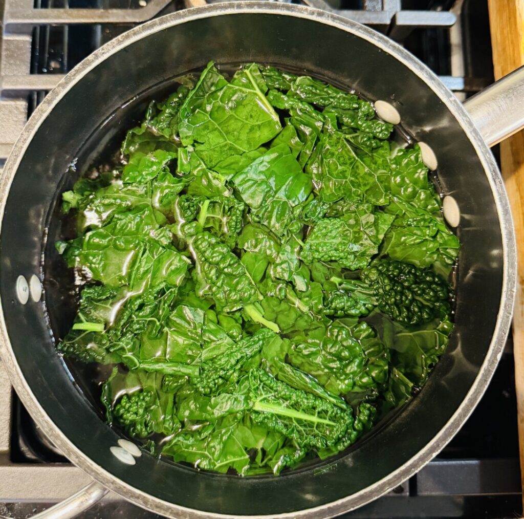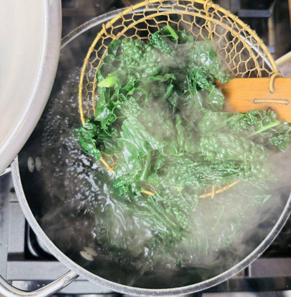 - Immerse the kale in the boiling water and cook for about 30 seconds or until wilted and slightly softened.