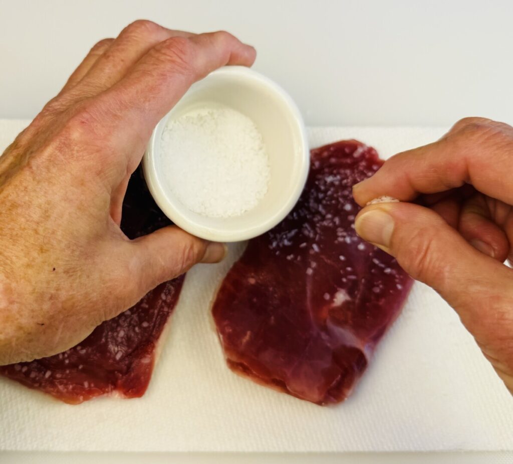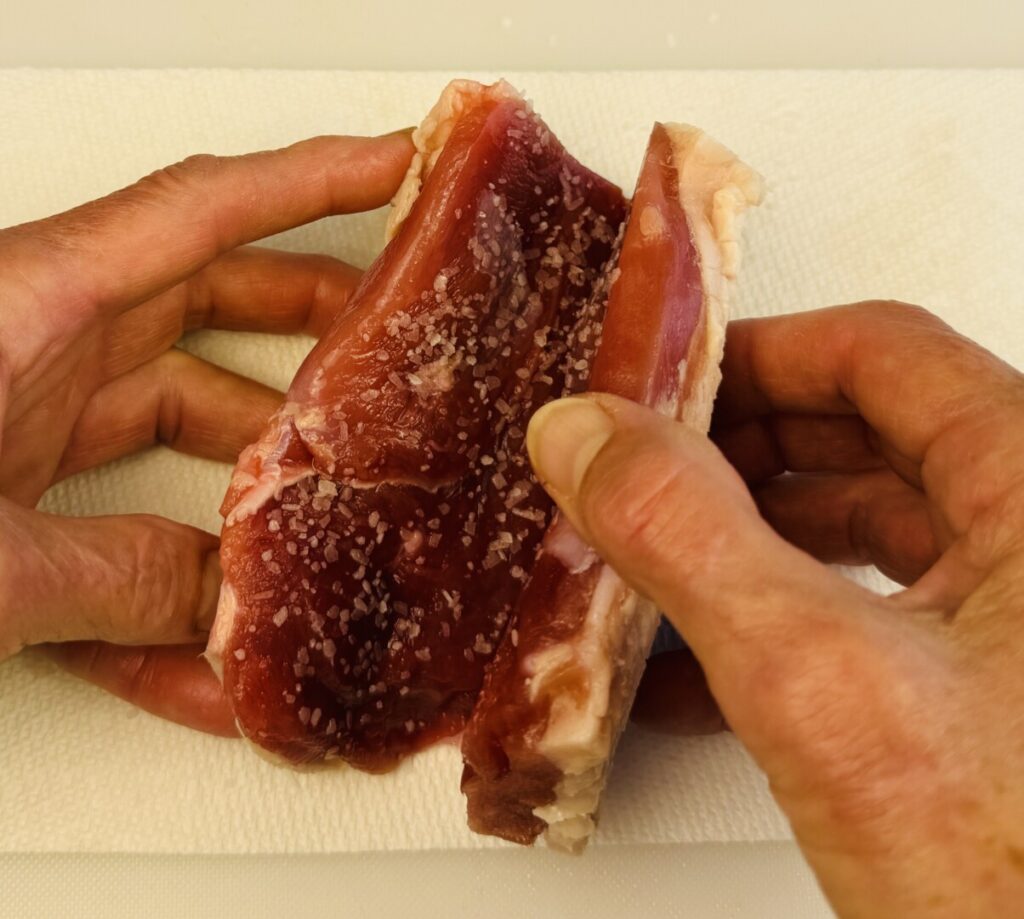 - Season the flesh side of the breasts lightly with salt, and then put the salted flesh sides together.