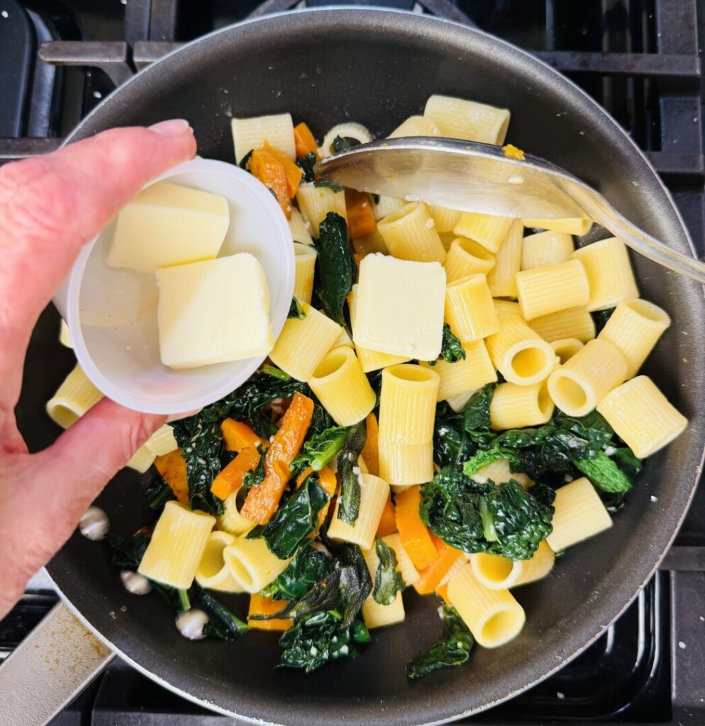 - Stir the butter in to the pasta until it emulsifies into a creamy sauce and there are no visible butter chunks.