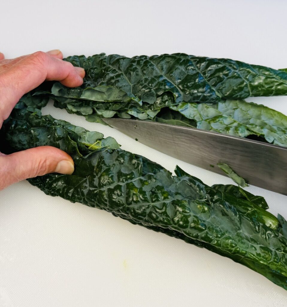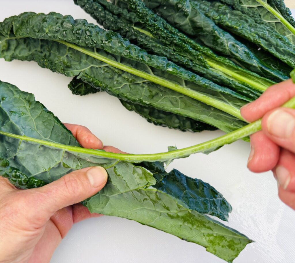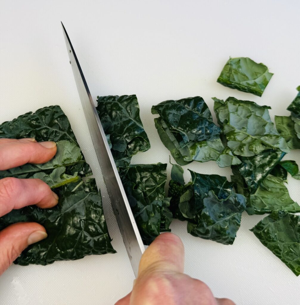 - Remove the thick veins from the kale leaves and discard. Cut the kale into rough 1 ½ -inch squares.