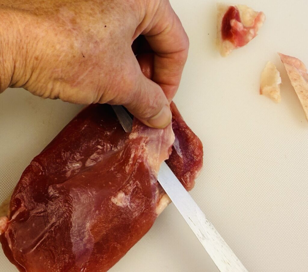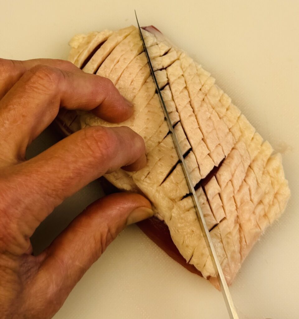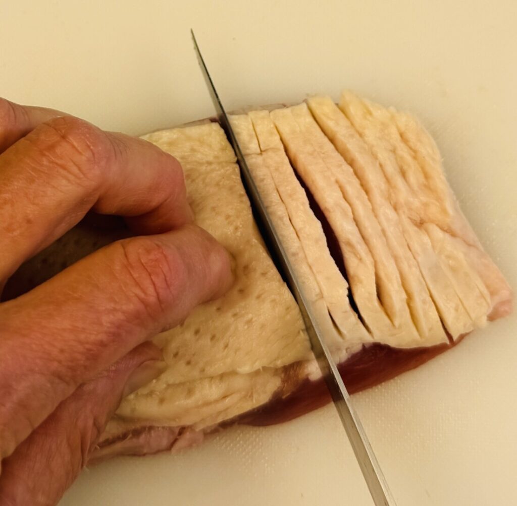 6. Trim and score the duck breasts. (If using chicken breasts, omit the scoring step.)