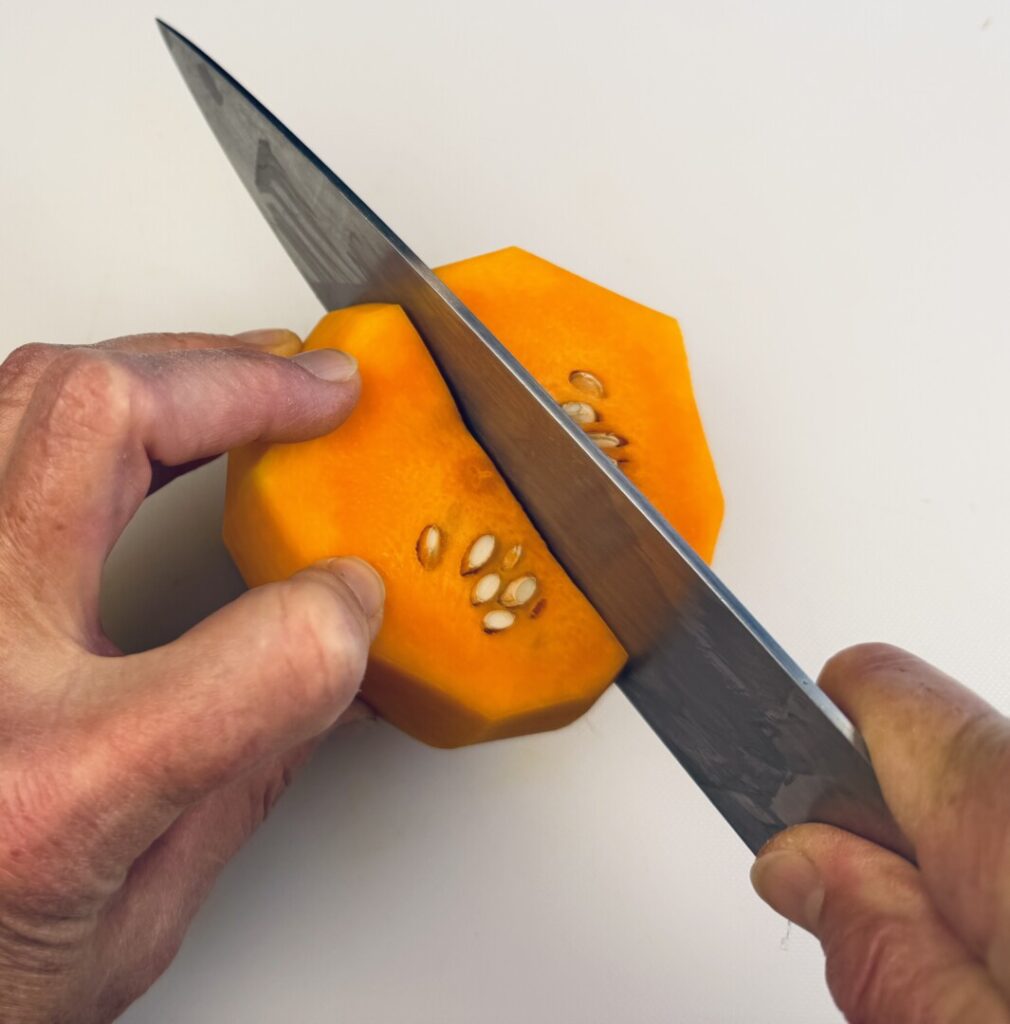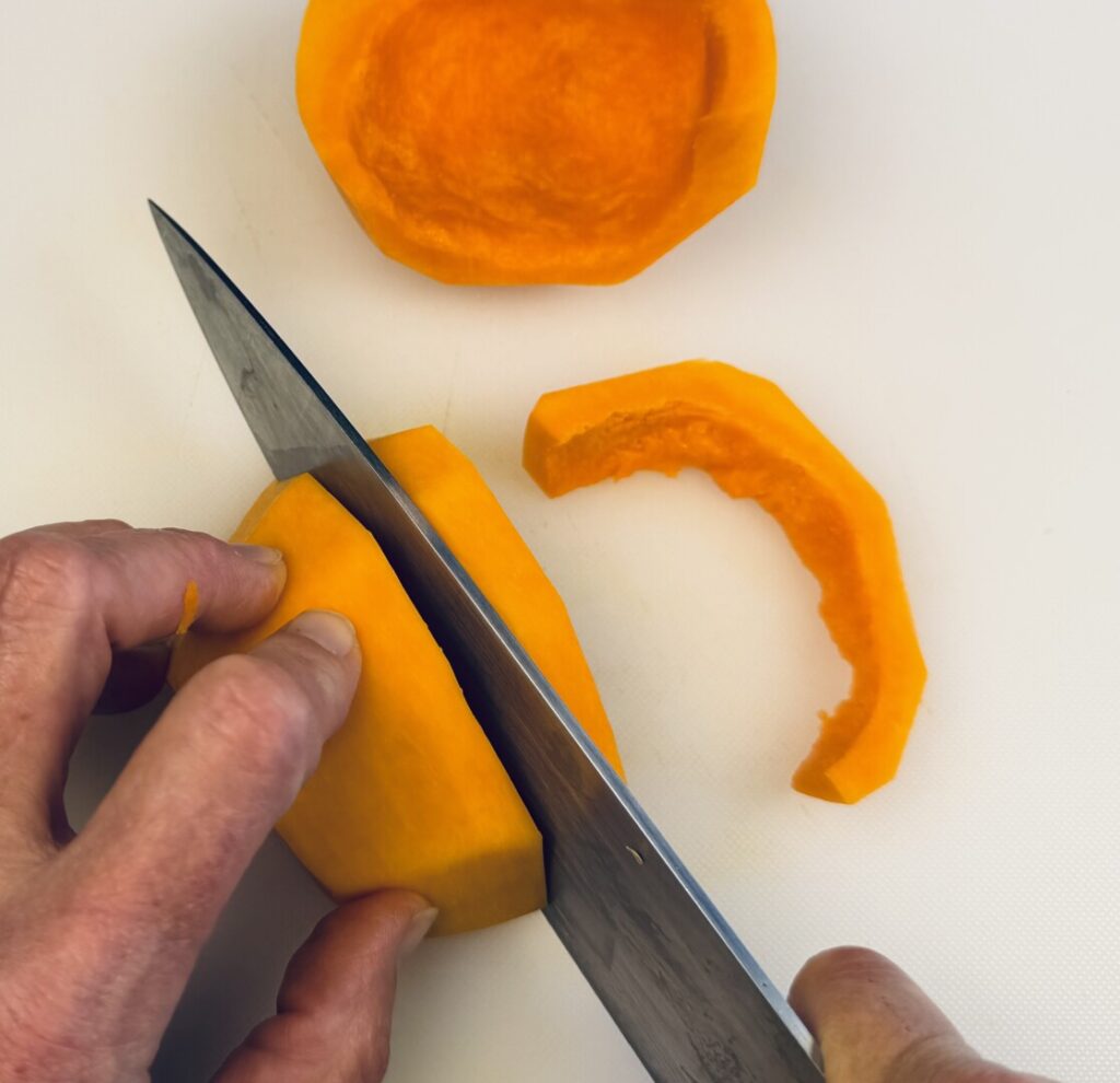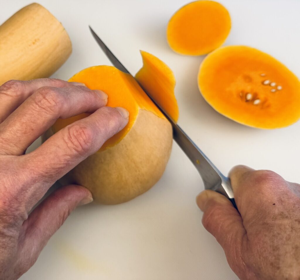 - Stand the bulbous squash half upright on one of its cut ends and, using a sharp boning knife, make downward cuts all around the circumference of the squash to remove its thick skin.