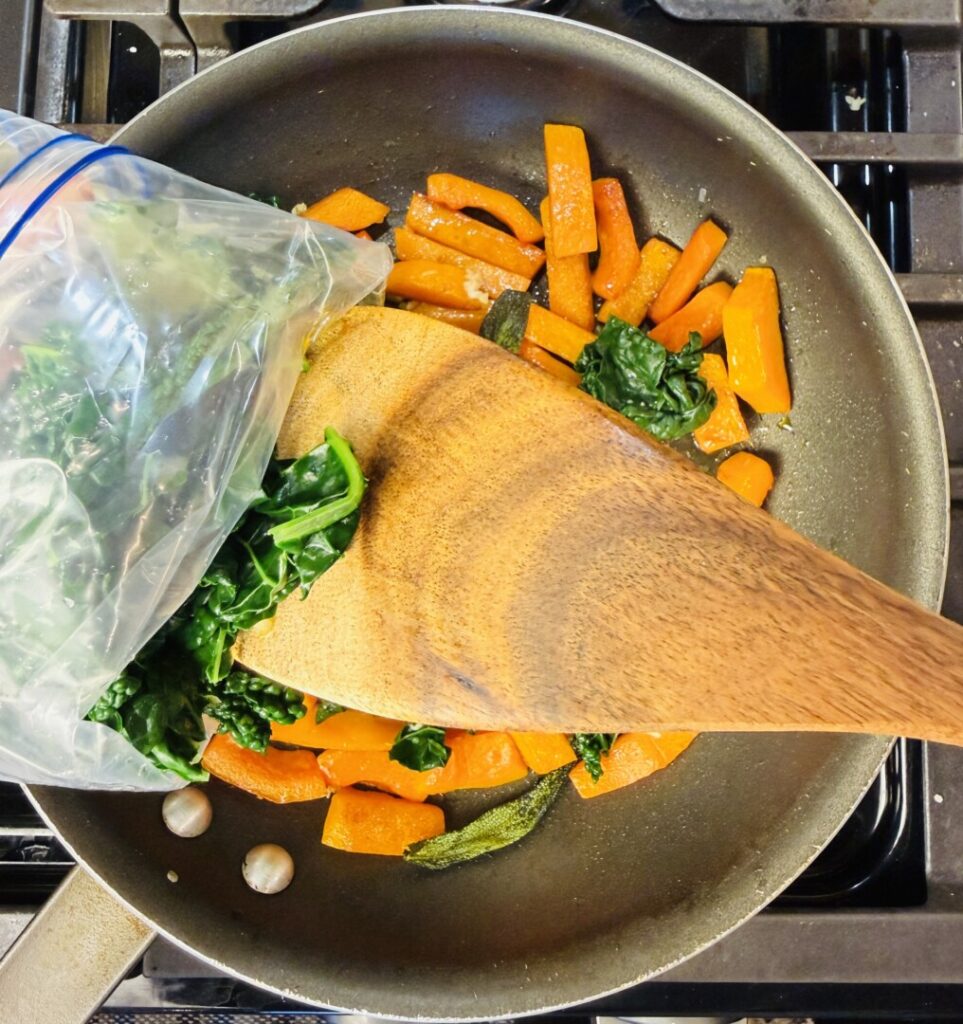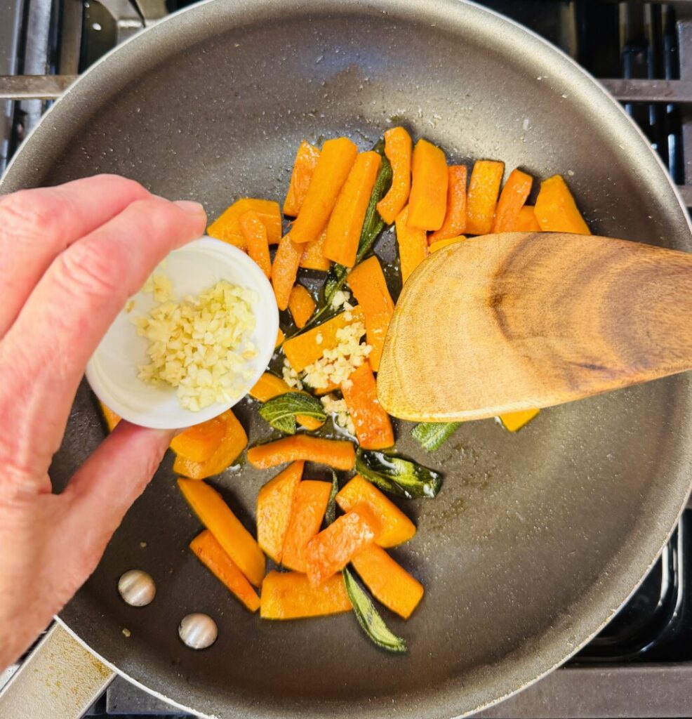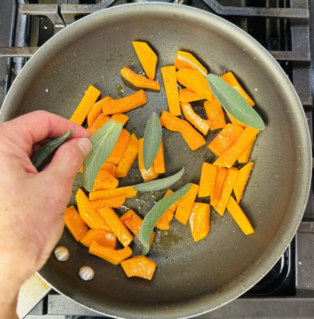 - Place a non-stick sauté pan over medium heat, add 1 Tbsp olive oil, then add the squash and a pinch of salt. Sauté for about 1 minute until the edges begin to brown. Turn the heat to low and add the sage leaves. Continue sautéing, turning the squash occasionally, for about 3 minutes longer until the squash softens to an al dente texture and the edges turn golden brown.