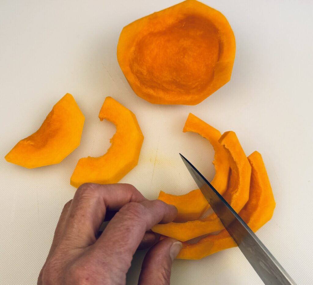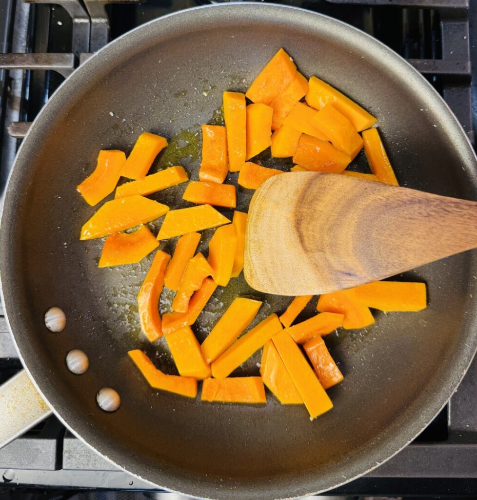 - (If using pre-cut squash, trim the cubes of any stringy pulp left during processing.)