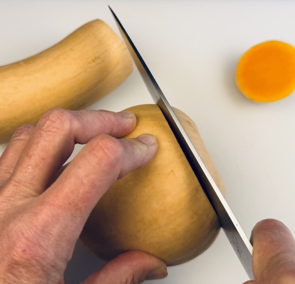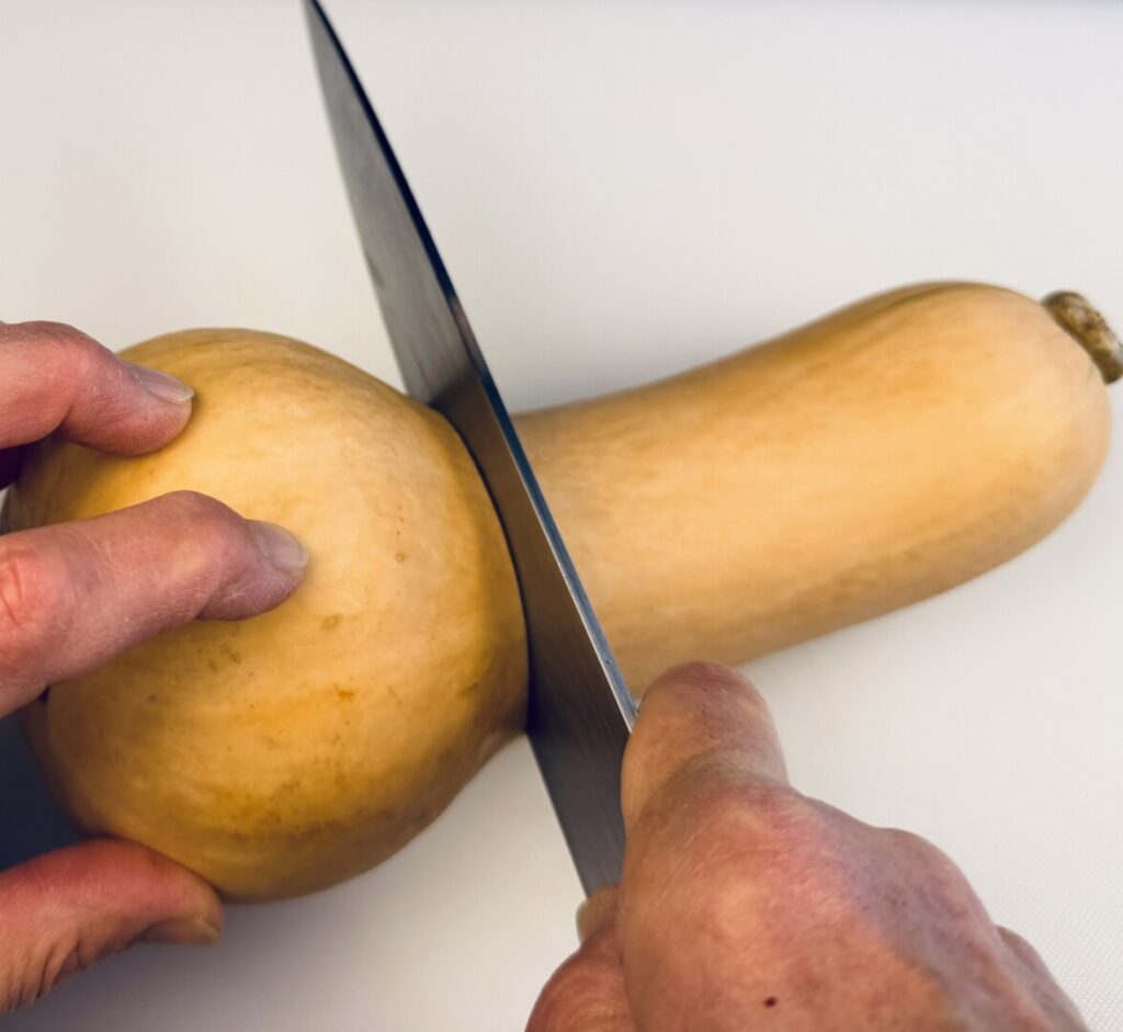 - Use a chef knife to cut the squash in half, widthwise, at the place where its narrow neck joins the bulbous part.