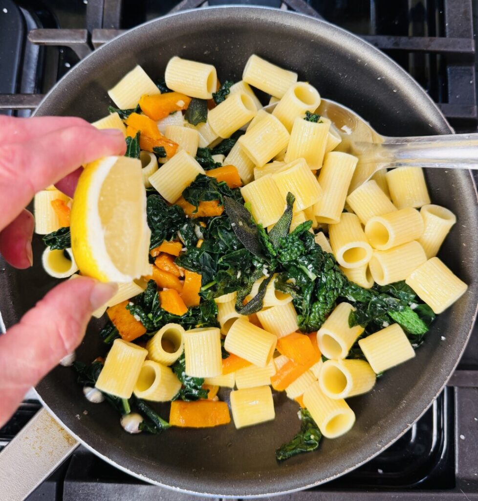 Raise the pasta water to the boil and cook the rigatoni to an al dente texture. Use a “spider” strainer to lift the rigatoni out of the water and into the sauté pan. Squeeze in the lemon, cover, and hold at the back of the stove.