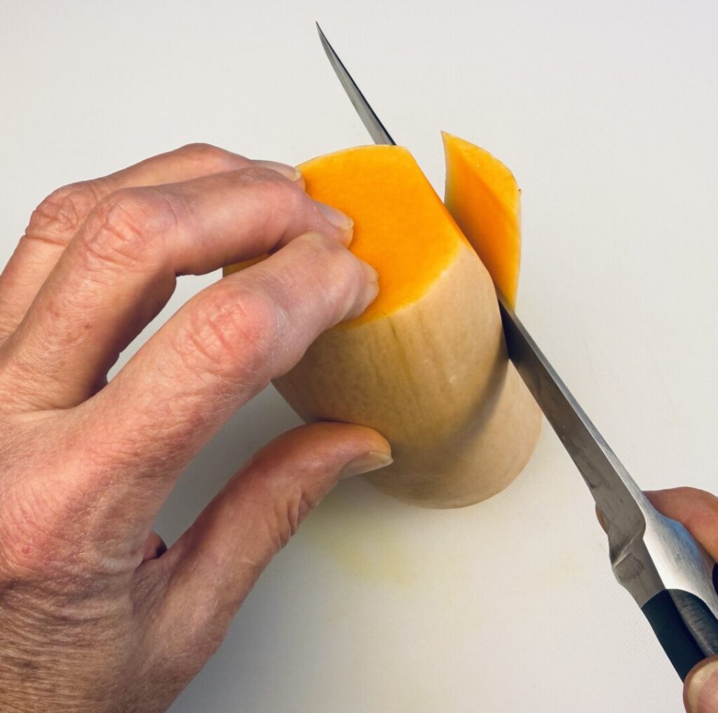 First, cut the squash in half where the solid neck joins the hollow, bulbous part. Then trim off the stem end (of the neck) and the blossom end (of the bulbous part). Because the skin of a winter squash is too thick for a swivel peeler, you’ll use a French technique called peler à vif. Stand the squash section upright with the larger end on the cutting board. Using a sharp, flexible boning knife, and following the contour of the vegetable, slice down into the flesh just adjacent to the skin. Do this all around the circumference of the squash section. You may need to go back and trim off any skin you missed, especially at the bottom near the cutting board.