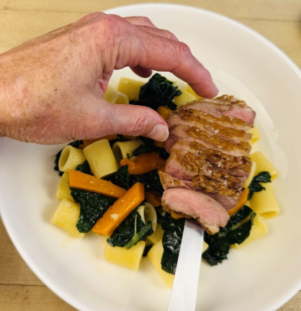 In times gone by—and still today in many rural areas—late fall ushers in hunting season. All along the shores of lakes and estuaries, and here in the Chesapeake watershed, it’s time for the autumn duck migration, when wild duck traditionally is on the menu. Unless you are or know a duck hunter, you’re unlikely to have access to wild waterfowl. But even if—as in this recipe—we use domestic duck, topping our pasta dish with sliced, pan-roasted duck breast makes it feel autumnal.