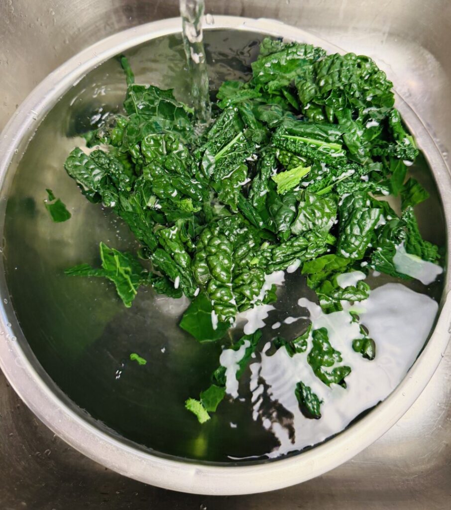 - Use a “spider” strainer to transfer the kale into the bowl of cold water, and then place the bowl in the sink under cold running water for about 2 minutes until completely cold.