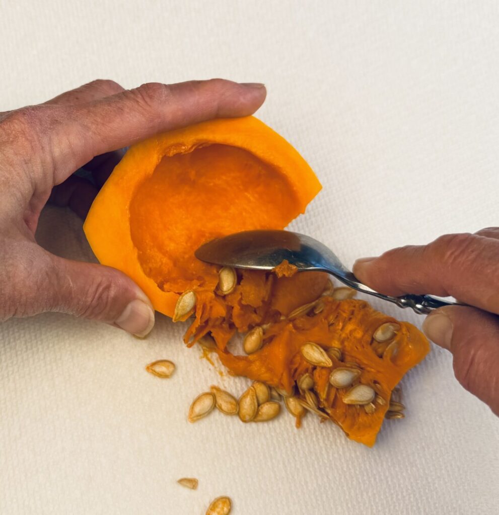 - Use the chef knife to cut the bulbous squash half in half lengthwise, and then use a spoon to scrape out all of the seeds and stringy pulp.