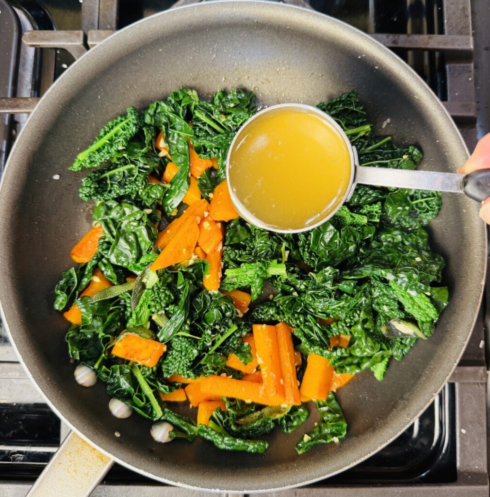 To start the sauce, heat some extra-virgin olive oil in a nonstick pan, and then add the squash with a pinch of salt. Sauté over medium heat, stirring often, for about 1 minute. Add the sage leaves and then sauté for about 3 minutes until the squash softens and becomes lightly browned around the edges. Stir in the garlic and then add the blanched kale; stir to coat it with oil. Add the chicken stock and remove from heat.