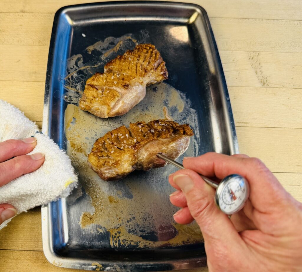 Roast duck breasts for 7 to 10 minutes to an internal temperature of 125°F. Roast skin-on boneless chicken breasts for about 20 minutes to 160°F. Cover loosely with aluminum foil and hold on the back of the stove until ready to carve and plate. Carryover cooking will raise the interior temperatures about 5 degrees.