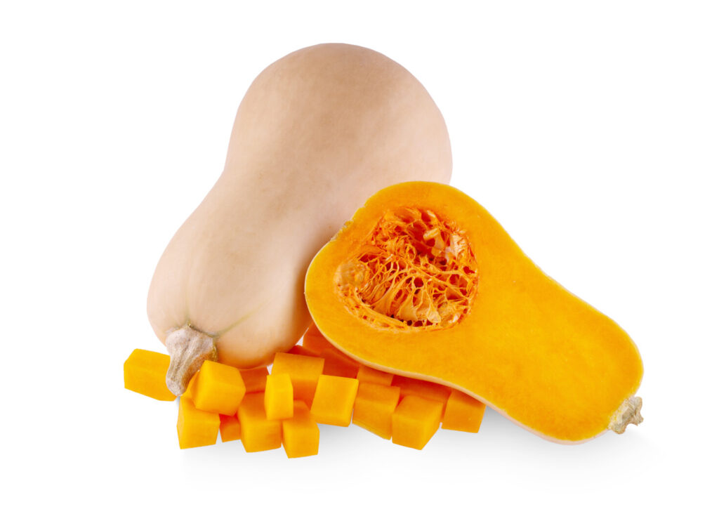 The cultivar name “butternut” refers both to its flavor and mouthfeel when cooked. Whereas all winter squashes and pumpkins feature notes of sweetness, the butternut variety is additionally known for its slightly nutty flavor. When cooked soft, the flesh has a buttery texture that enhances soups and purées.