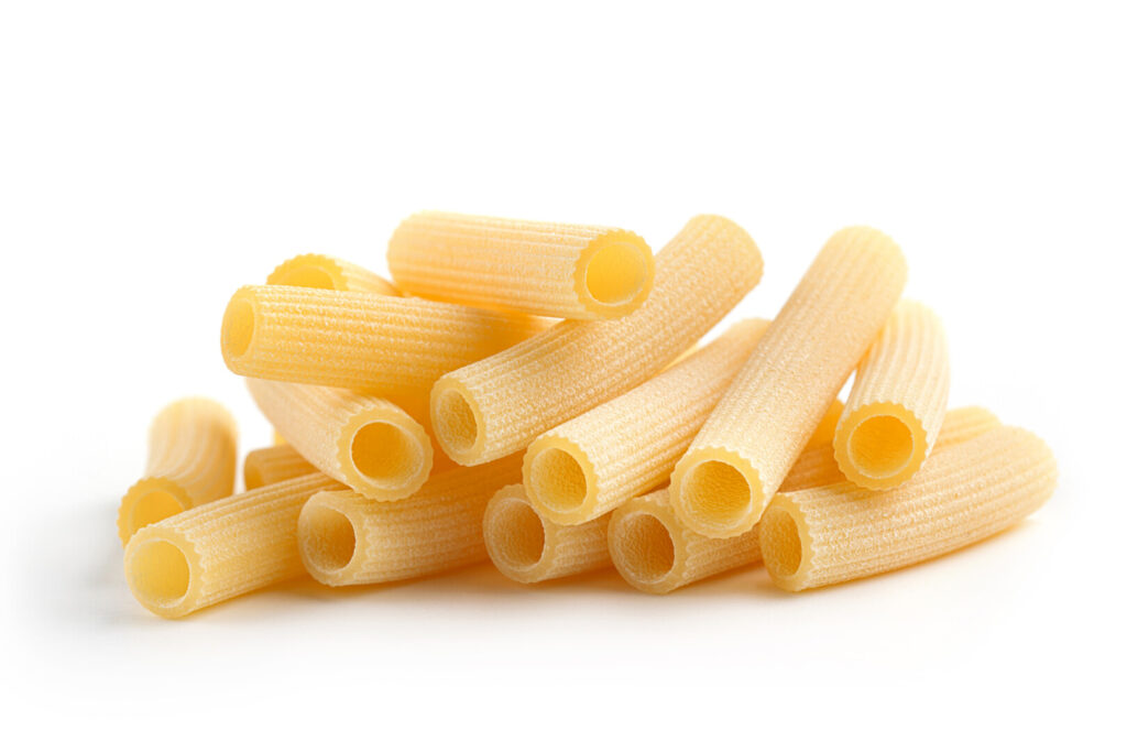 The length of standard rigatoni varies by manufacturer from 1 1/2 to 1 3/4 inches when raw, and the shapes expand even longer once cooked. I personally feel that the standard shape is too big to comfortably eat in one bite, and I always end up cutting each piece in half as I’m eating. So, when possible, I use mezzi rigatoni. These are roughly half as long and, for me, yield a perfect-sized mouthful. The choice is yours.