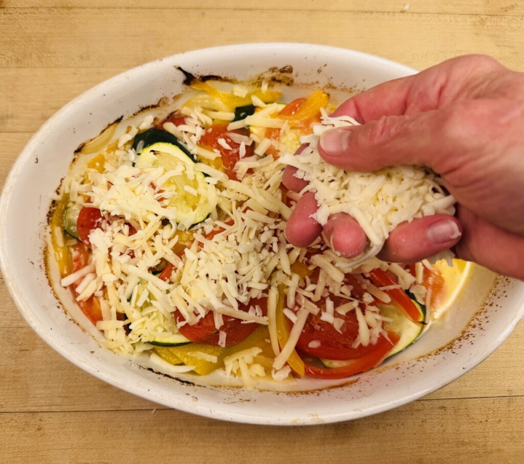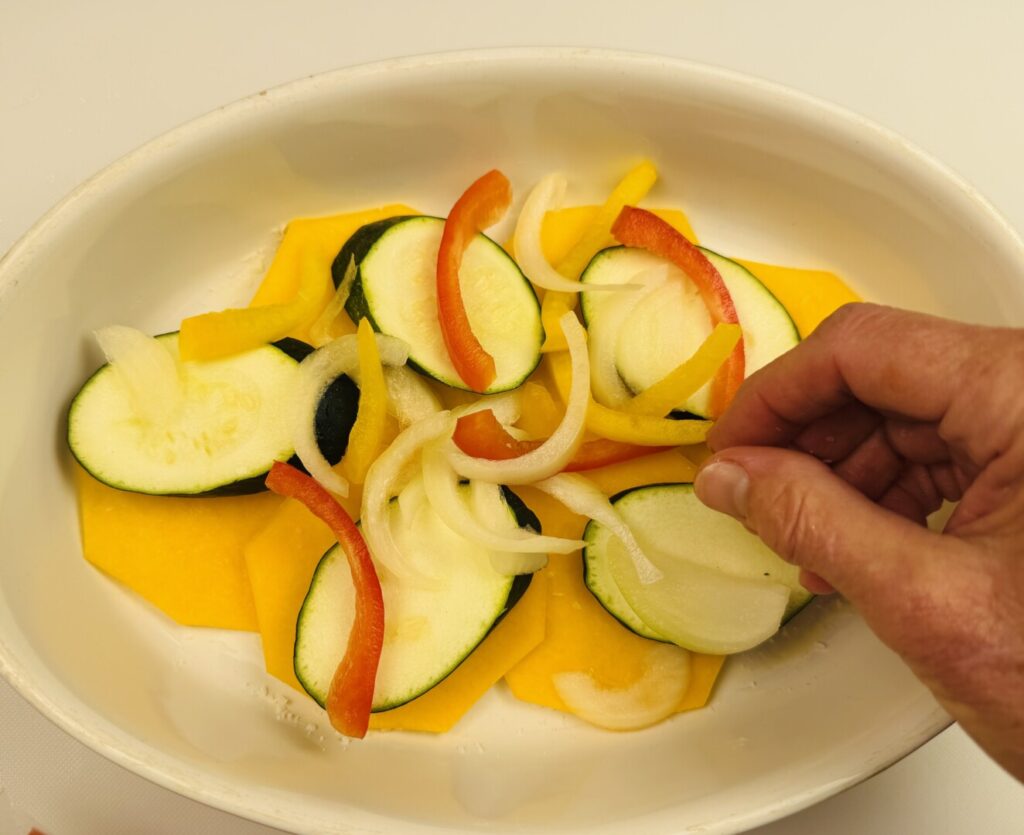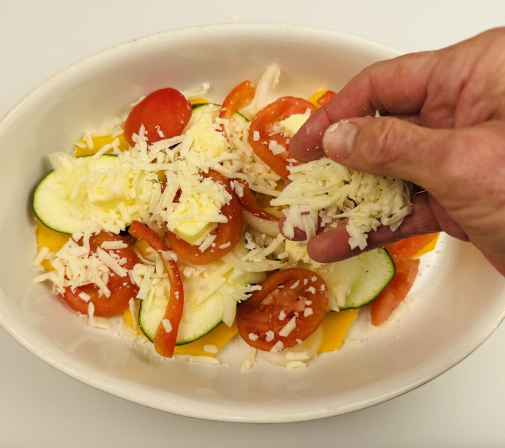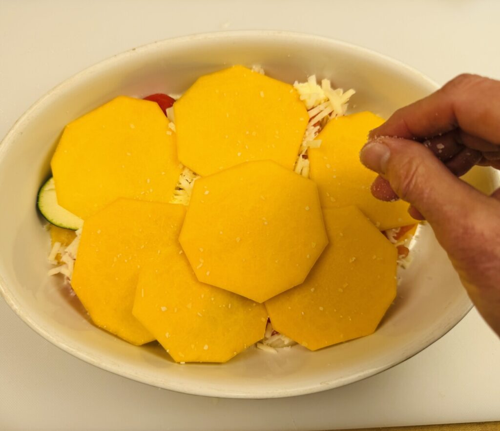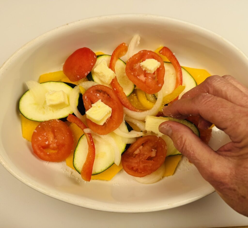 - Rub the bottom of a 10-inch gratin dish or pie pan with a thin coating of butter. Add half of the butternut squash in a single layer and sprinkle it with a very small amount of salt. (Salt very lightly as you proceed.) Add half the zucchini and salt it, then add half the peppers and onions with salt, and finish with half the tomatoes and salt. Dot the top of the first layer with half of the remaining butter and sprinkle with half of the cheeses. Repeat, using the remaining vegetables and butter, but don’t put any cheese on top. Reserve the remaining cheese for later.
