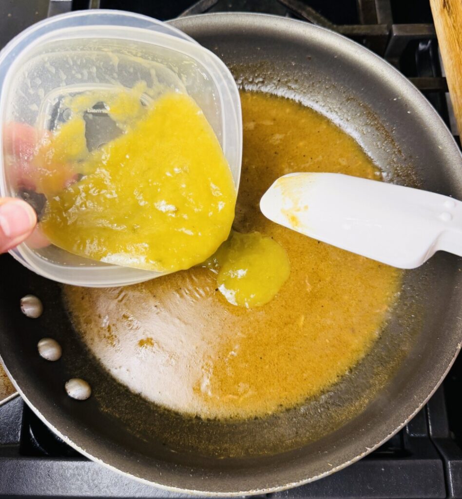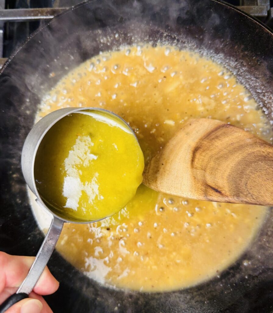 The second phase of braising is simmering in flavorful liquid to cook through and tenderize the meat. So, next, you’ll make the sauce in which the pork will simmer. This recipe begins with a basic pan velouté sauce. Gently sauté chopped onions in the fat from the pork until golden brown, then stir in some flour to make a roux. Add minced garlic and then slowly stir in chicken stock to make a smooth sauce. When developing this recipe I used Hatch brand green chile enchilada sauce, which is lightly thickened with cornstarch. I added half of the total amount for the braising sauce, reserving the other half to add to the sauce just before serving. If the green chile product you’re using is unthickened, you’ll need to use about 50% more flour in your roux (and probably add a little more oil to the pan while making the roux). Check the salt content in your green chile sauce and season accordingly.