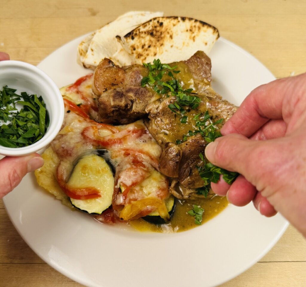 Divide the gratin into equal portions and place one on the back left of each warmed plate. Arrange pieces of pork country spareribs on the front right. Nap the pork with sauce. Fold two tortillas into quarters and tuck them under the pork at the back of the plate. Sprinkle a line of parsley on the pork.