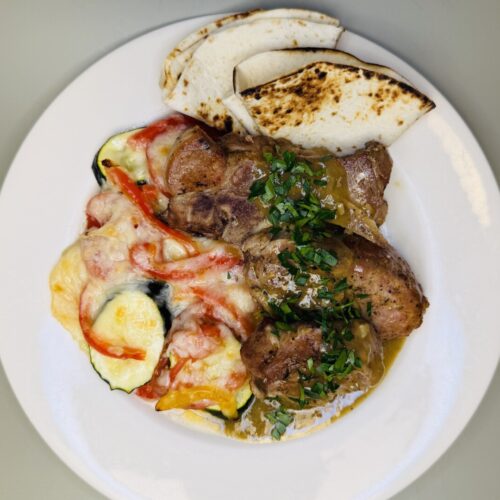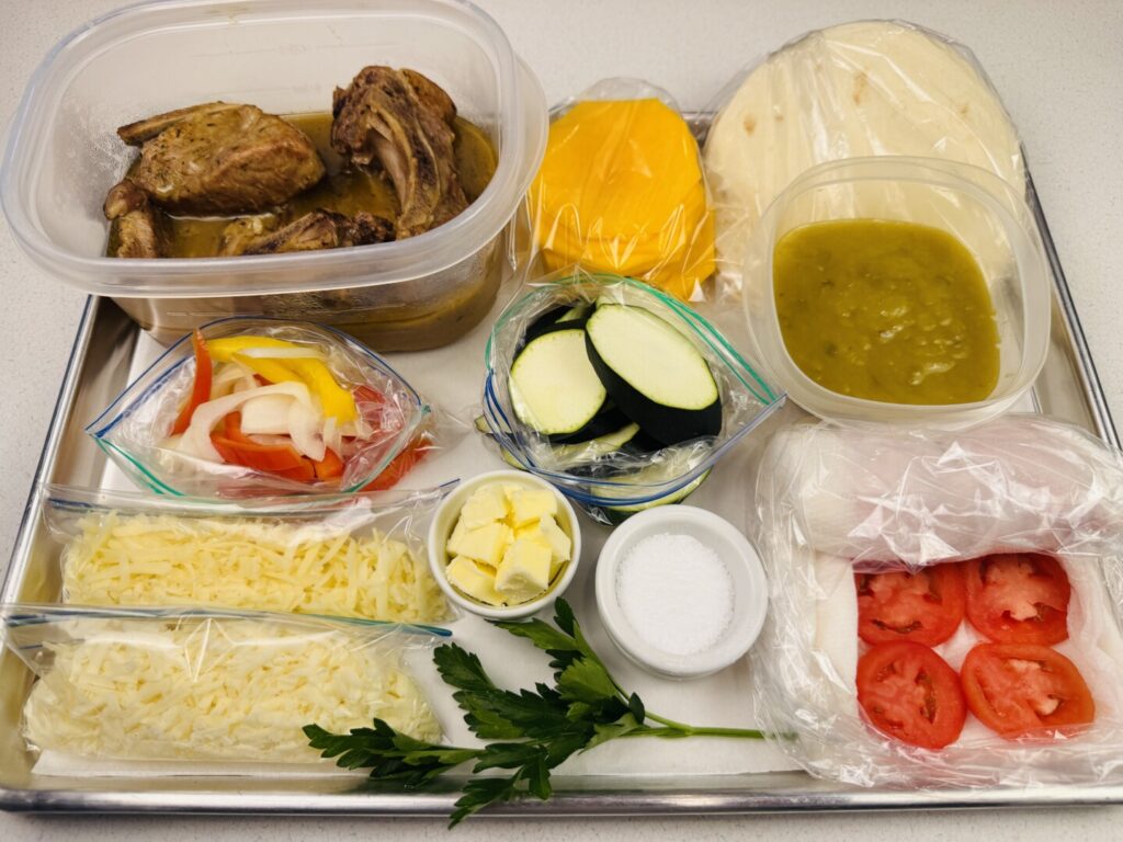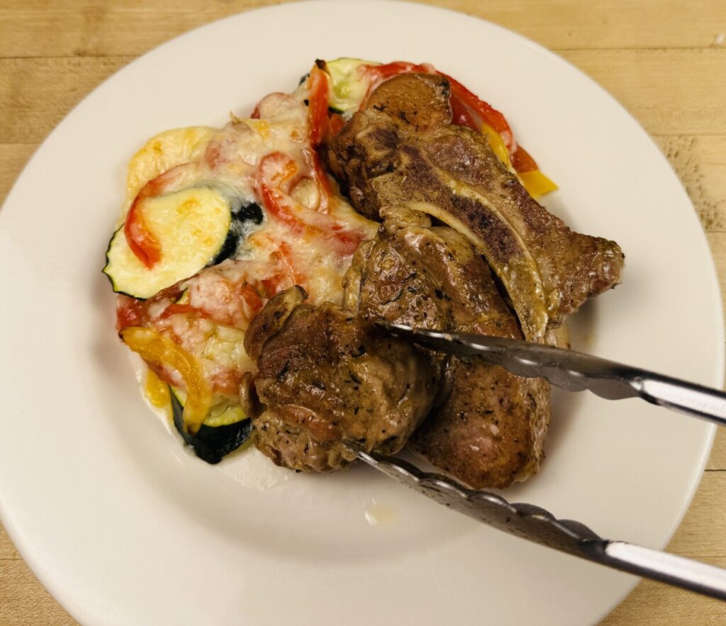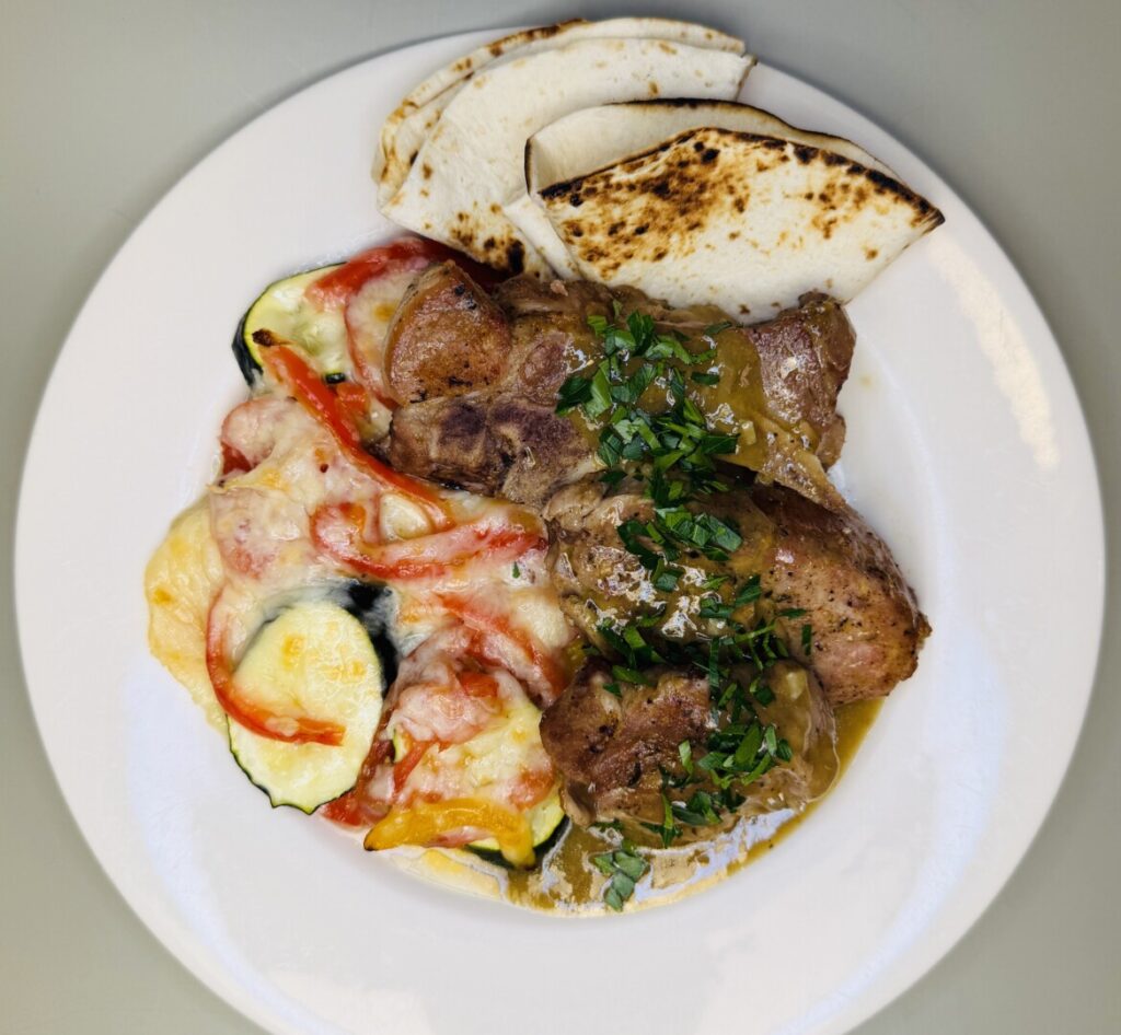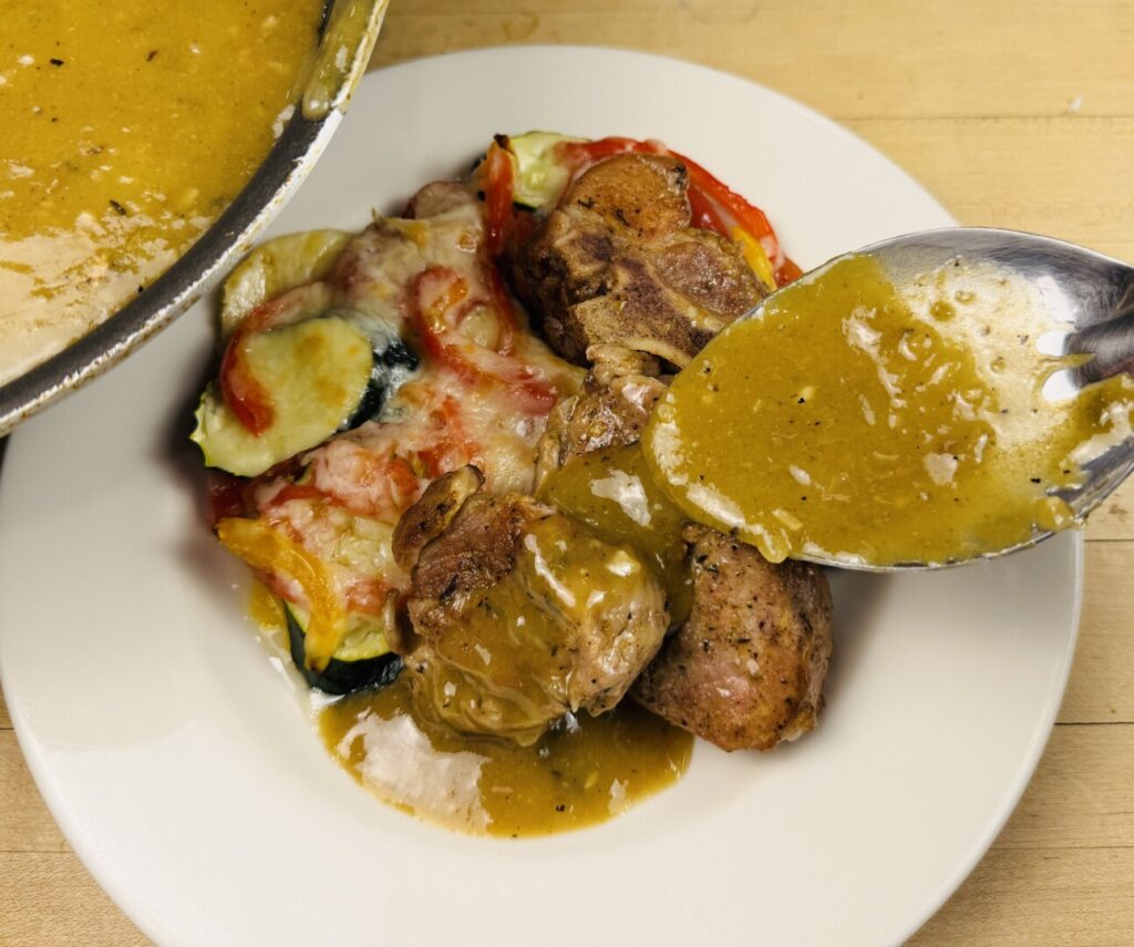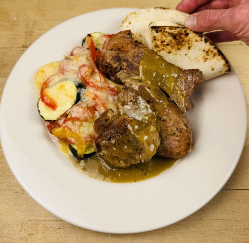 Green Chile Pork Country Spare Ribs with Cheesy Roasted Vegetable Gratin and Toasted Tortillas