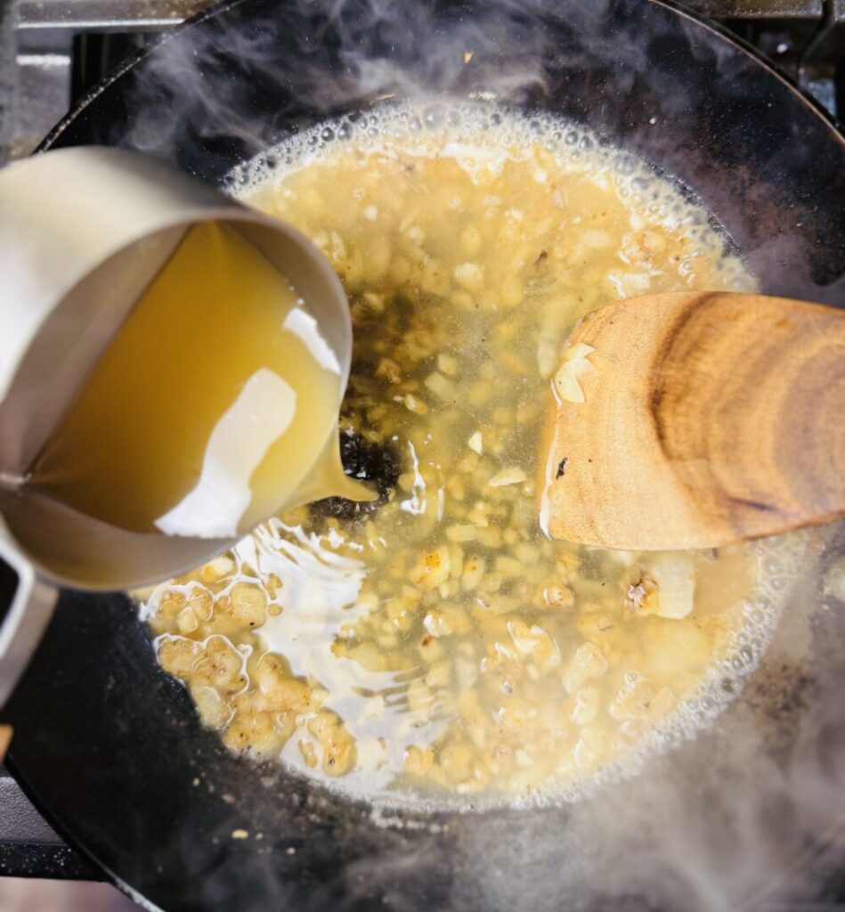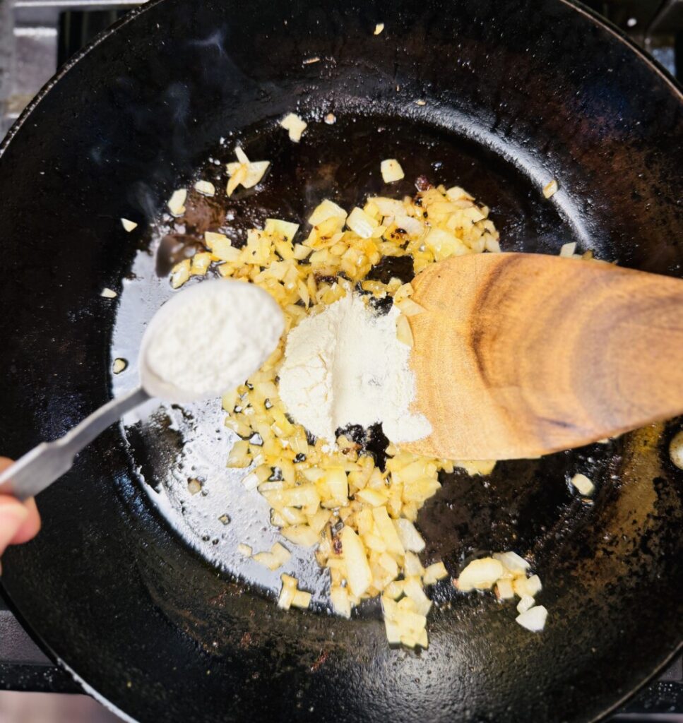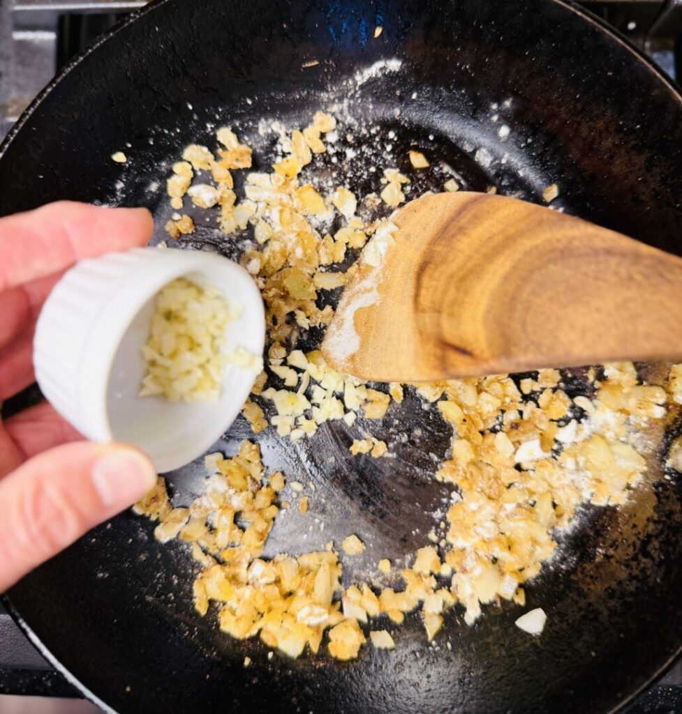 - There should be about 2 Tbsp fat remaining in the pan; if not, add a little more oil. Add the chopped onion and sauté for about 30 seconds, then stir in the garlic and flour. Stir for a few seconds until smooth, then stir in the chicken stock. Bring to the simmer and cook, stirring occasionally, for about 1 minute until the sauce thickens.