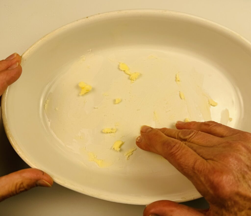 Then repeat with the remaining vegetables, salt, and butter, but don’t add the cheese topping. Cut out a piece of parchment to fit the top of the gratin, and press it down to firm the vegetable layers. Bake for about 20 minutes, until a knife inserted into the vegetable meets no resistance.