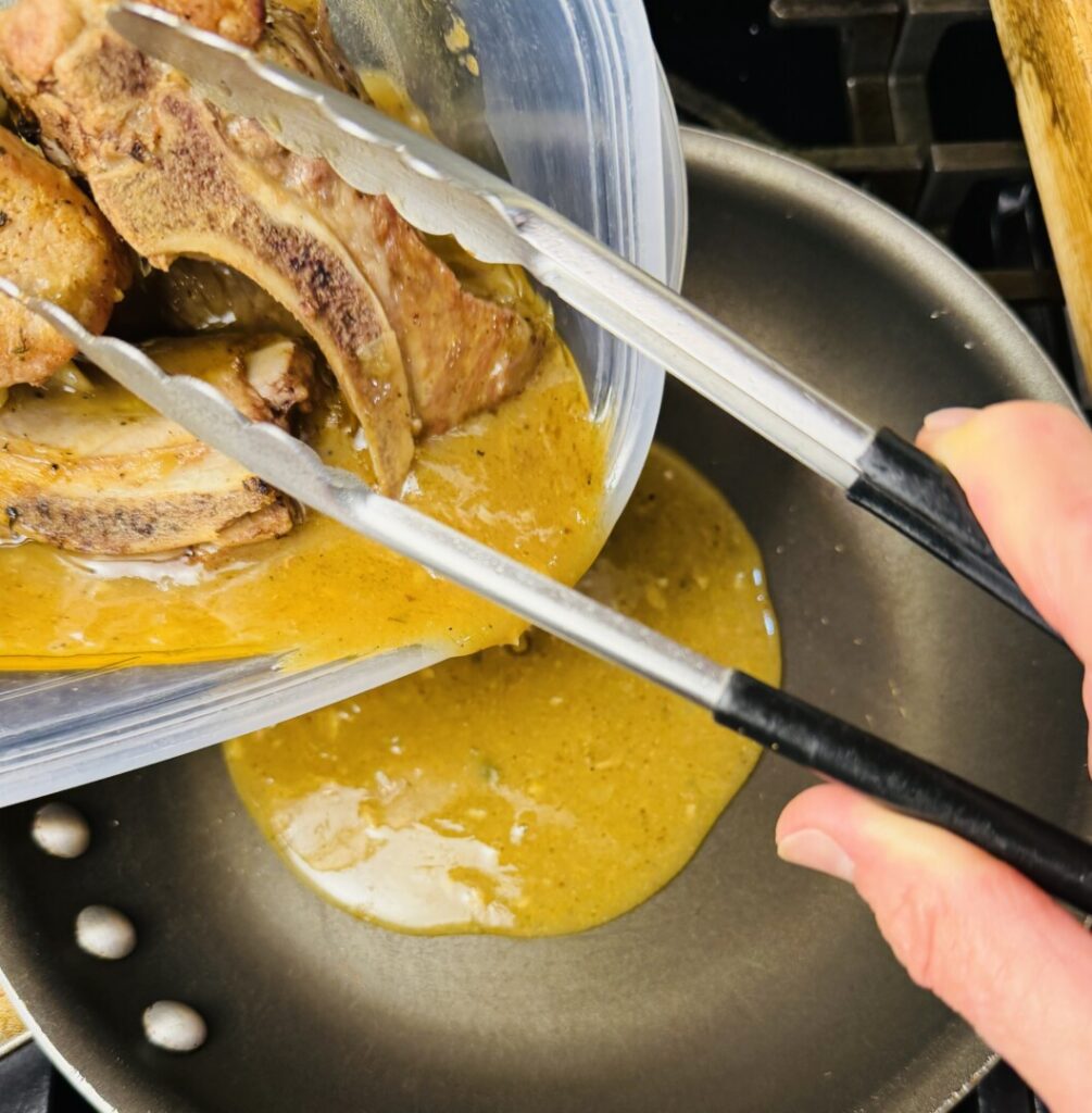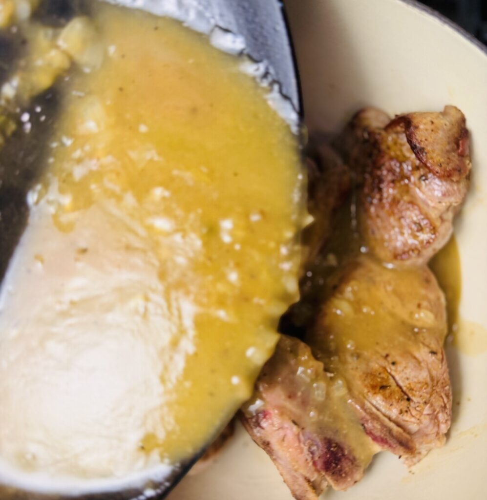 11. Reheat the pork and finish the sauce: