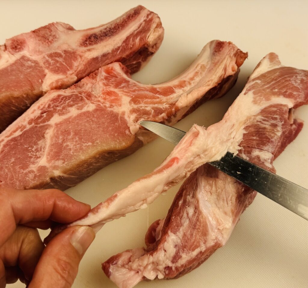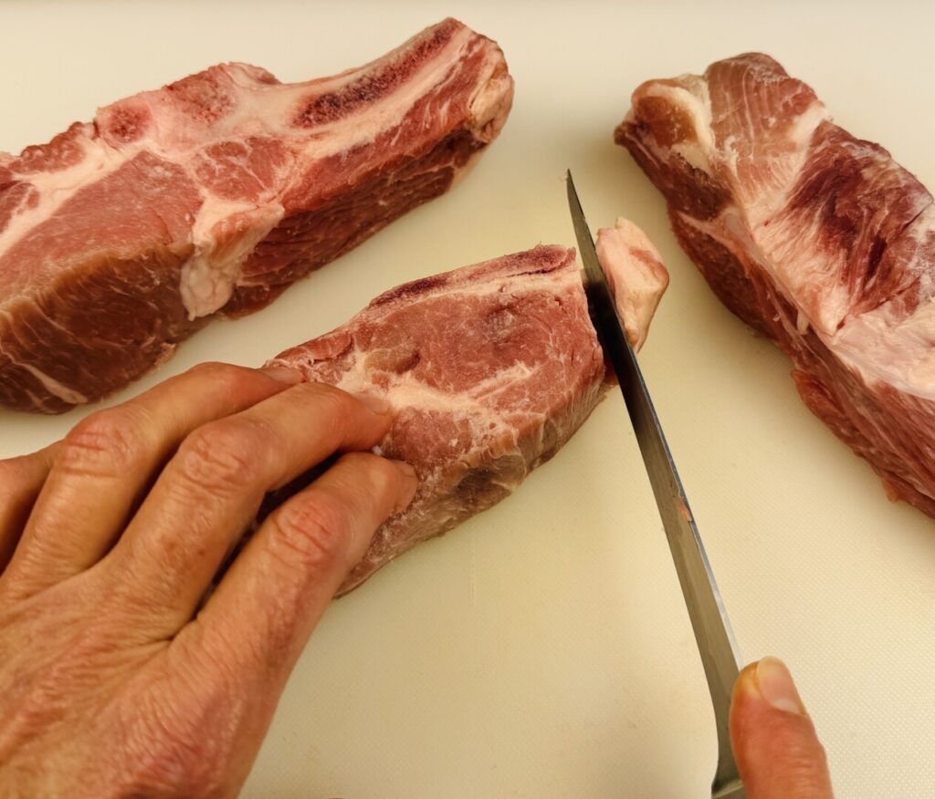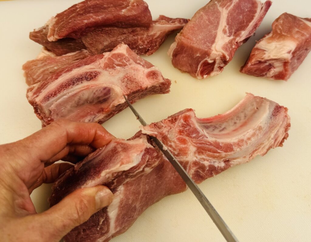 - Wipe the country spareribs dry with paper towels and trim off any thick surface fat. If the spareribs are long, cut them in half widthwise. To help with this, find the articulation place on each sparerib’s bone by bending and/or twisting it until the bones begin to separate; then cut through. (Refer to the photos in the lesson section of this post.)