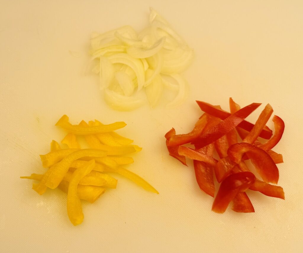 - Cut the onion and peppers into large juliennes about 1 ½ inch in length.