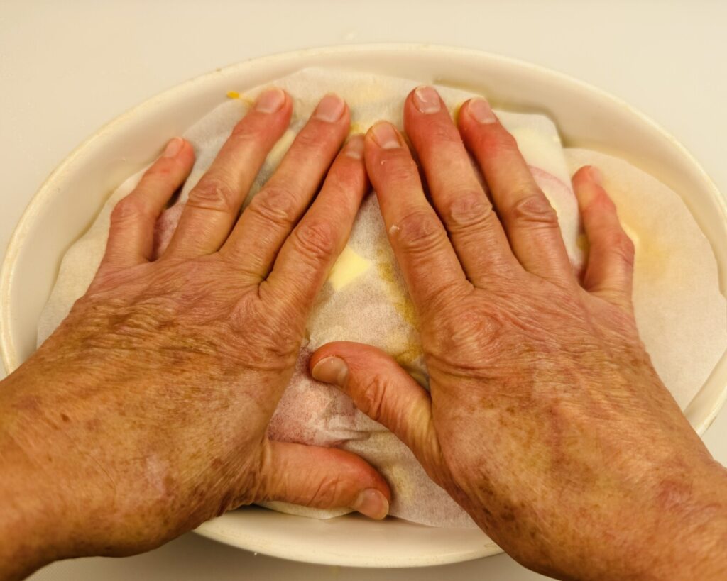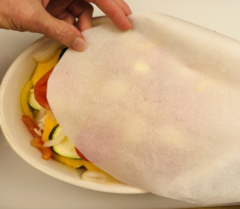 - Cut a sheet of parchment to exactly fit the top of the gratin, place it on top of the vegetables, and press firmly to compact them.