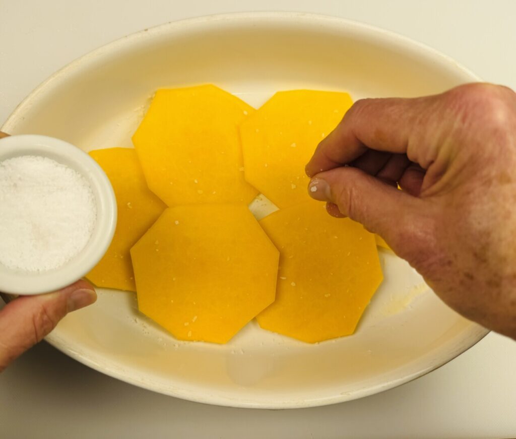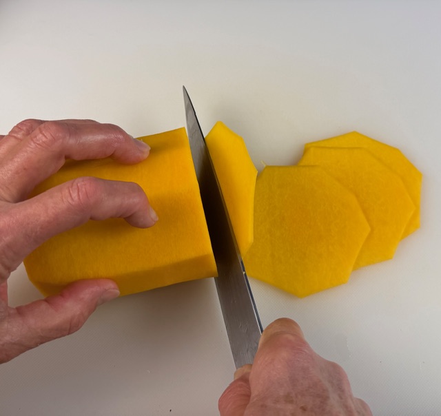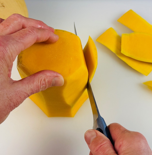 - Trim and peel the butternut squash and, if using the bulbous end, scrape the seeds and pulp out of its cavity. (Refer to the cooking lesson section of this post for more information about this task.) Slice the squash, preferably into rounds, about ⅛ inch thick.