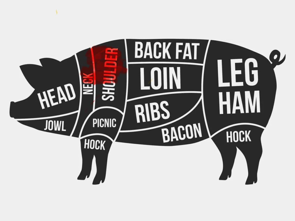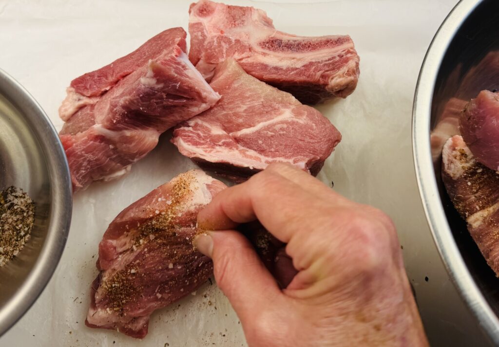 In this recipe we’re featuring pork country-style spare ribs. Country spare ribs aren’t really spare ribs at all—they are long, narrow strips of meat and bone cut from the pork shoulder/neck area of the carcass. The location of country spare ribs is shown highlighted in red on the pork cuts diagram on the left.