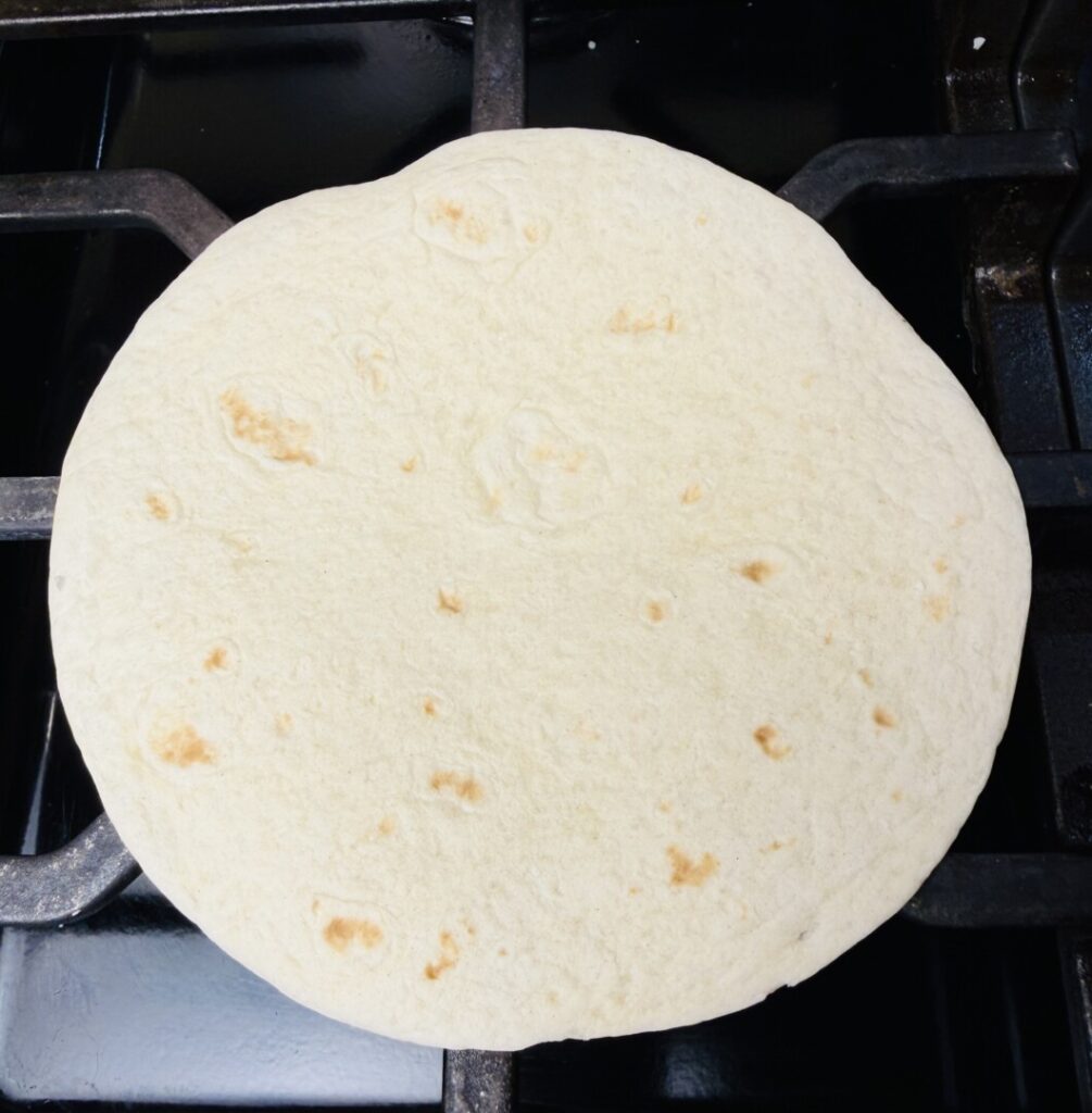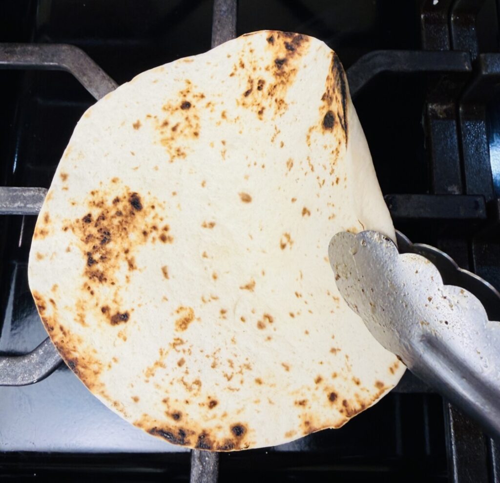 - Place a tortilla on the burner for 8 to 10 seconds until it softens and begins to acquire brown flecks. Use tongs to turn it over and toast for a few seconds longer. Transfer to the basket and cover with the napkin. Repeat with the remaining tortillas.