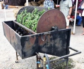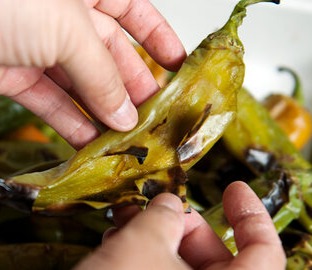 New Mexico chiles have thick, fibrous skins that must be removed before eating. The best way to do this is to roast them, a process that additionally adds a delicious smoky flavor. Throughout the region, from September through October the air is perfumed by the irresistible scent of roasting chiles. Some cooks do this at home on a gas or charcoal grill, or over a gas stove burner. But many entrepreneurial chile growers offer the service of roasting their customers’ chiles outdoors in a revolving mesh drum that looks something like a lottery-draw spinner. After the chiles are roasted and cooled, cooks take home their cache of chiles and process them to freeze for use throughout the year. The chiles are peeled, seeded, and then chopped or puréed to use in scores of traditional New Mexican dishes in late fall and beyond.