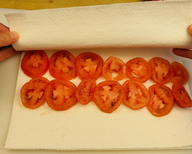 - Bring about 3 c water to the boil in a small saucepan. Lower in the tomatoes and blanch them for about 20 seconds, then place the pan in the sink and pour out the water. Run cold water in the pan for about 1 minute to refresh the tomatoes. Core and peel them, then cut them on a slight diagonal into slices a little less than ¼ inch thick. Lay out the slices on one side of doubled paper towels, fold the towels to encase them, and allow them to drain.