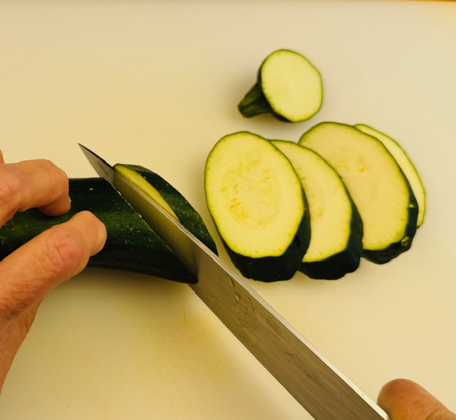 - Trim off the ends of the zucchini and cut it on the diagonal into slices slightly less than ¼ inch thick. (Don’t peel it.)