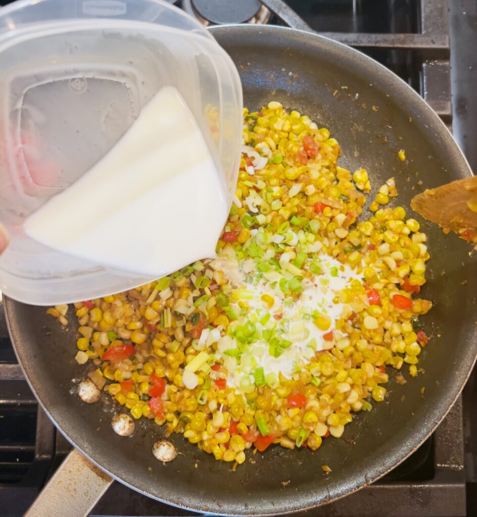- Turn the heat under the maque choux to medium. Add the scallions and cream and stir to combine.