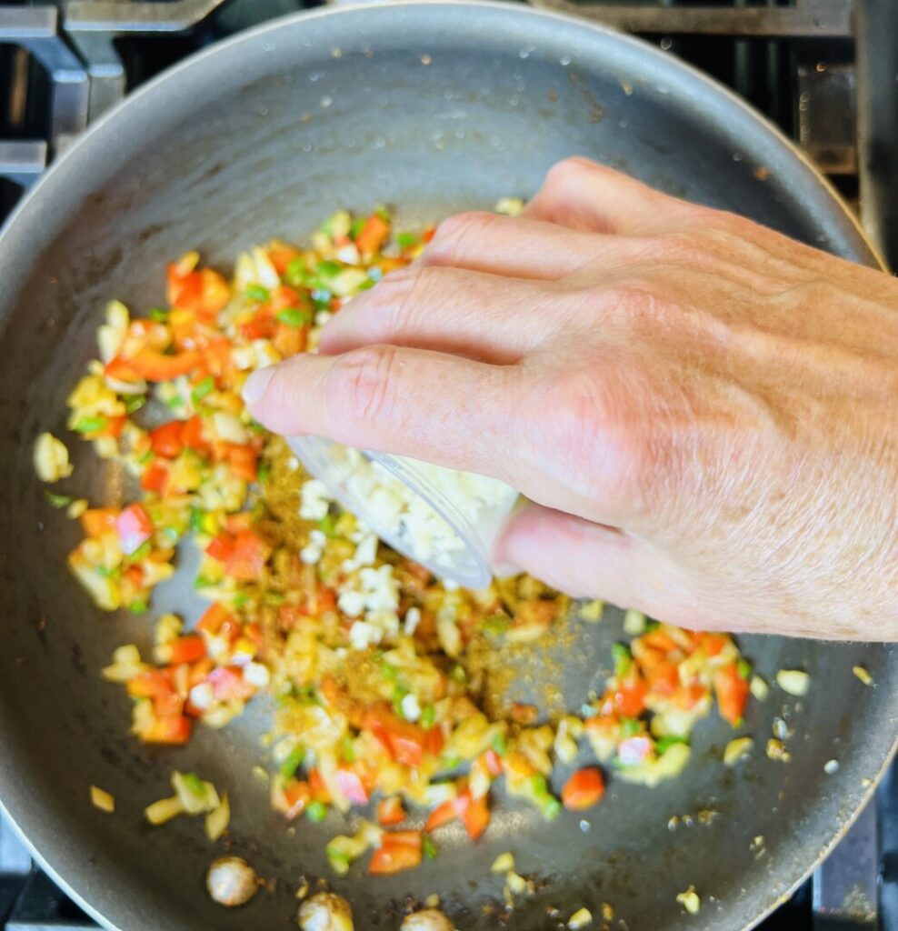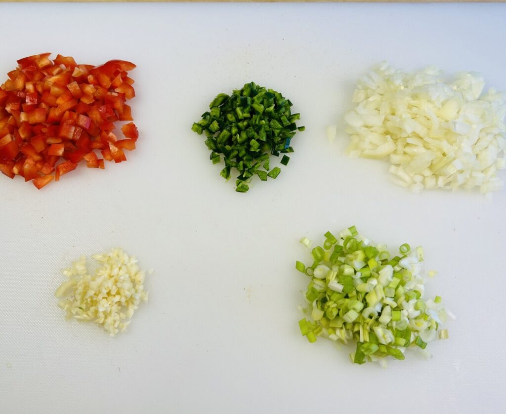 Finally, fabricate the red bell peppers, chiles, onion, garlic, and scallions. Package them per the recipe directions.