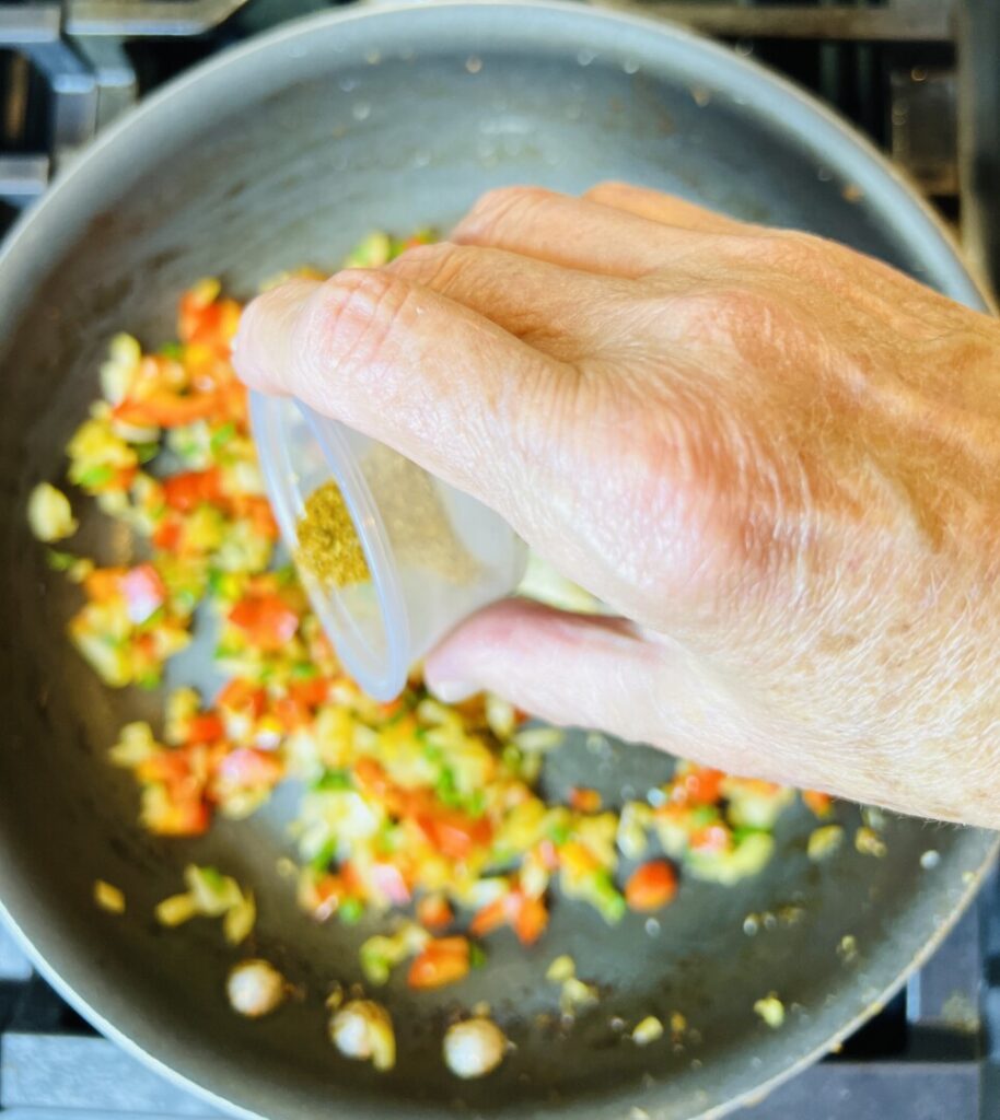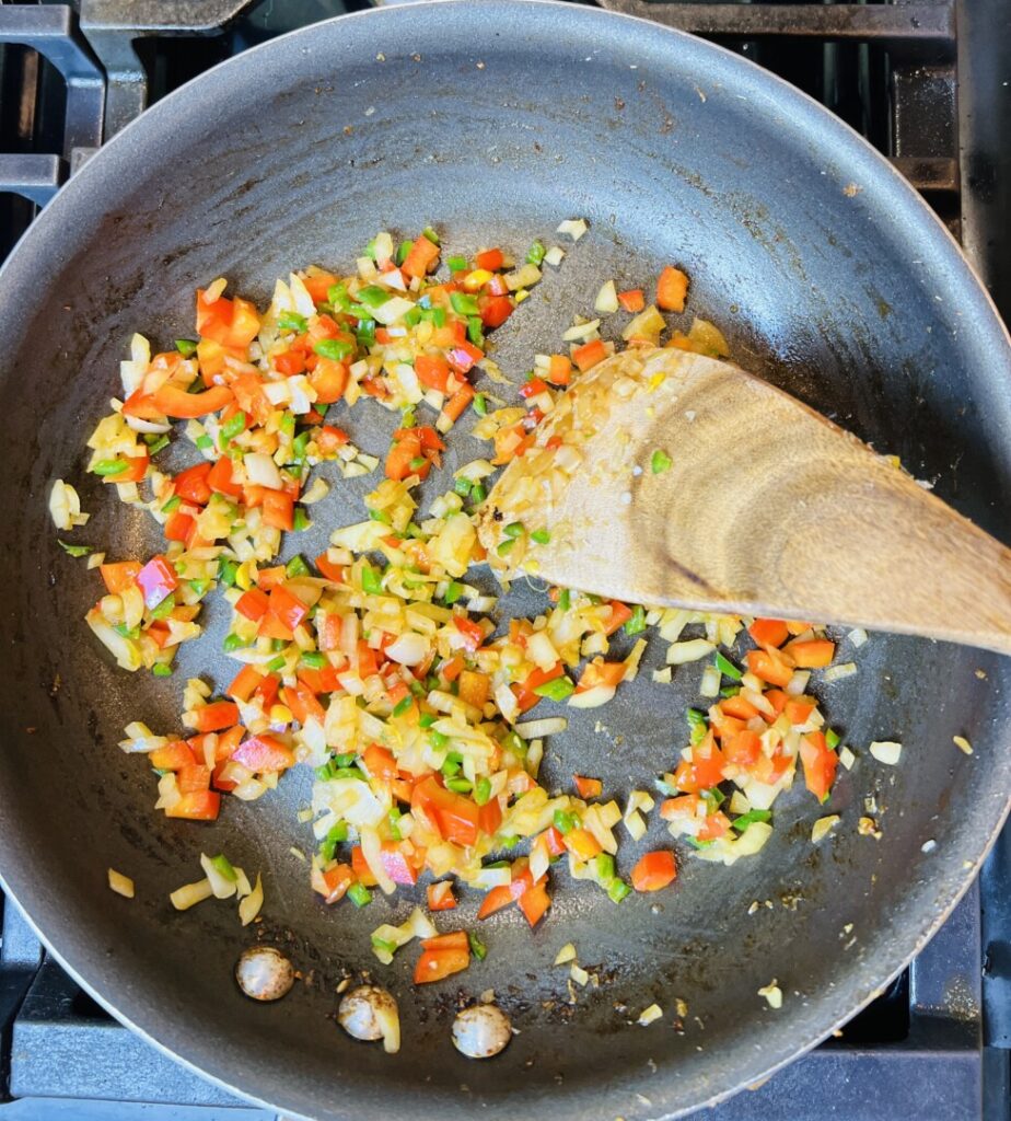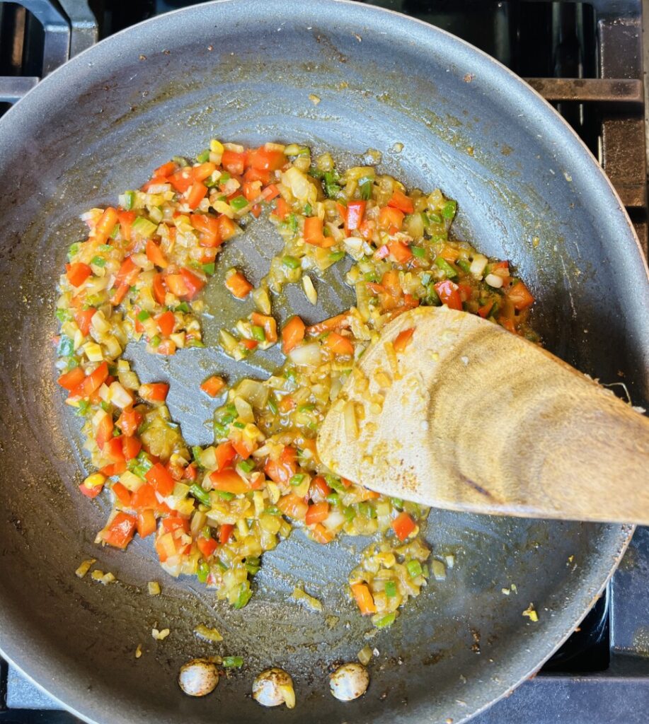 - Add the remaining bacon drippings or butter to the pan, and then add the bell peppers, chiles, and onions. Sauté over medium-low heat for about 3 minutes, scraping up the sucs, until the vegetables soften and begin to brown slightly. (If they brown too quickly before they soften, add a little water and cook until it evaporates away.)