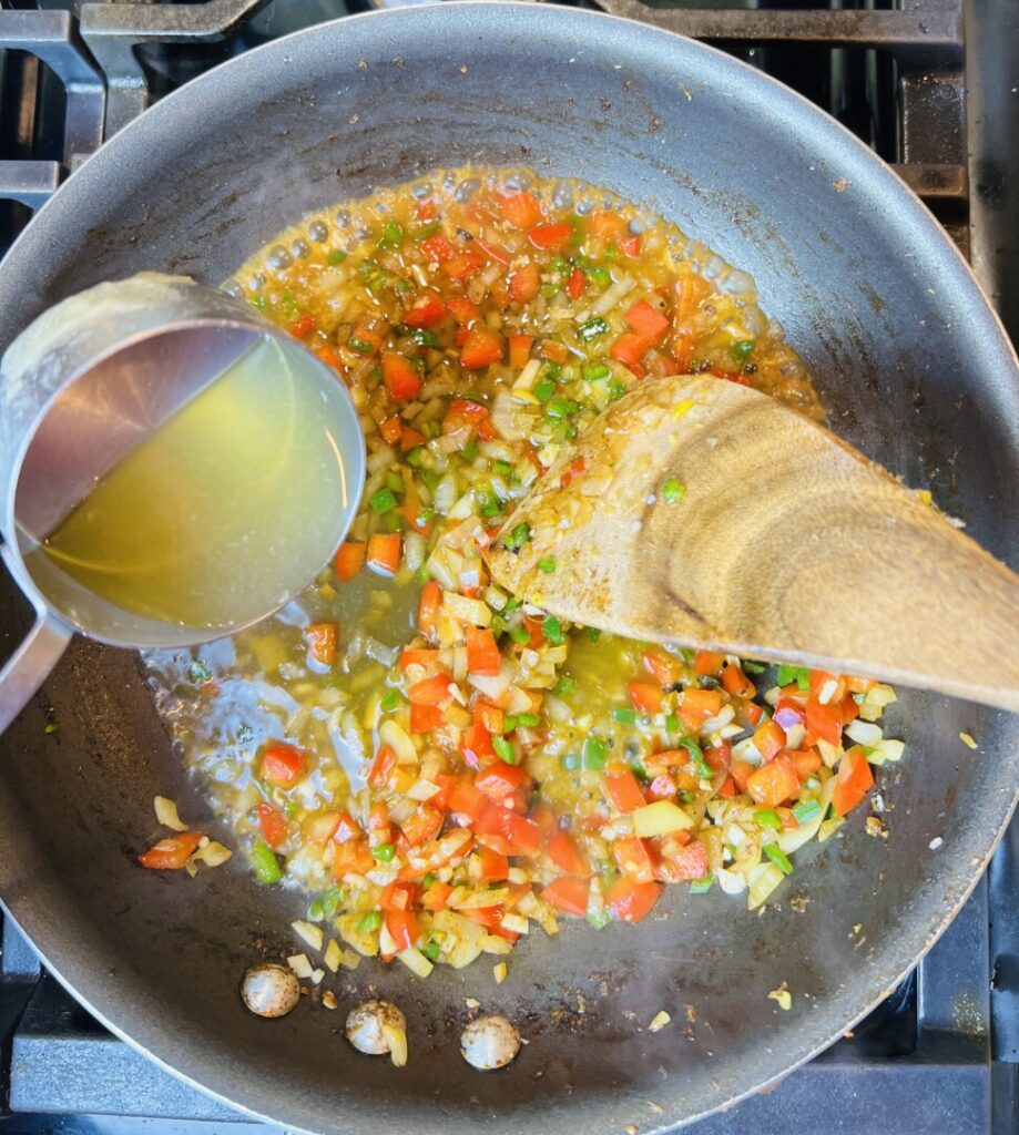Now add the vegetables to the pan and stir, scraping gently to lift the sucs. As the vegetables begin to cook, their natural water content is released and it hydrates the sucs, softening them and creating a “mini-roux” with their remaining starch. Sauté until the vegetables begin to brown, then add the garlic and Cajun seasoning. Complete the softening of the vegetables by adding half the chicken stock and simmering until it both absorbs into the vegetables and evaporates into a poultry glaze. This is your second step in Cajun browning, the beginning of flavor layering, and your first step in the Cajun reduction method.