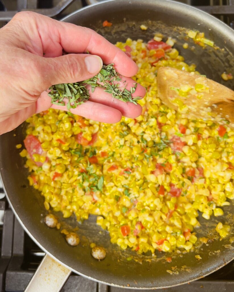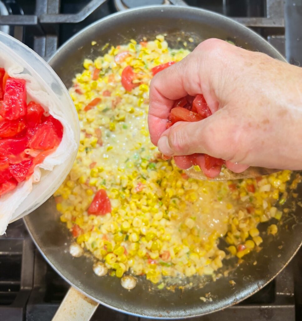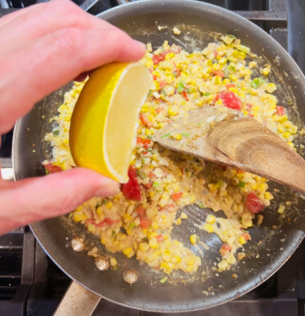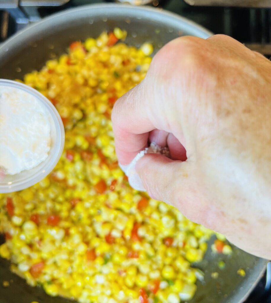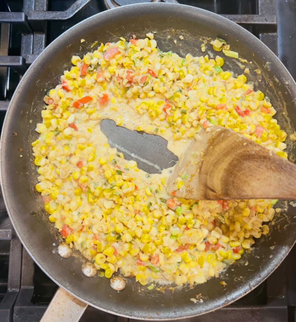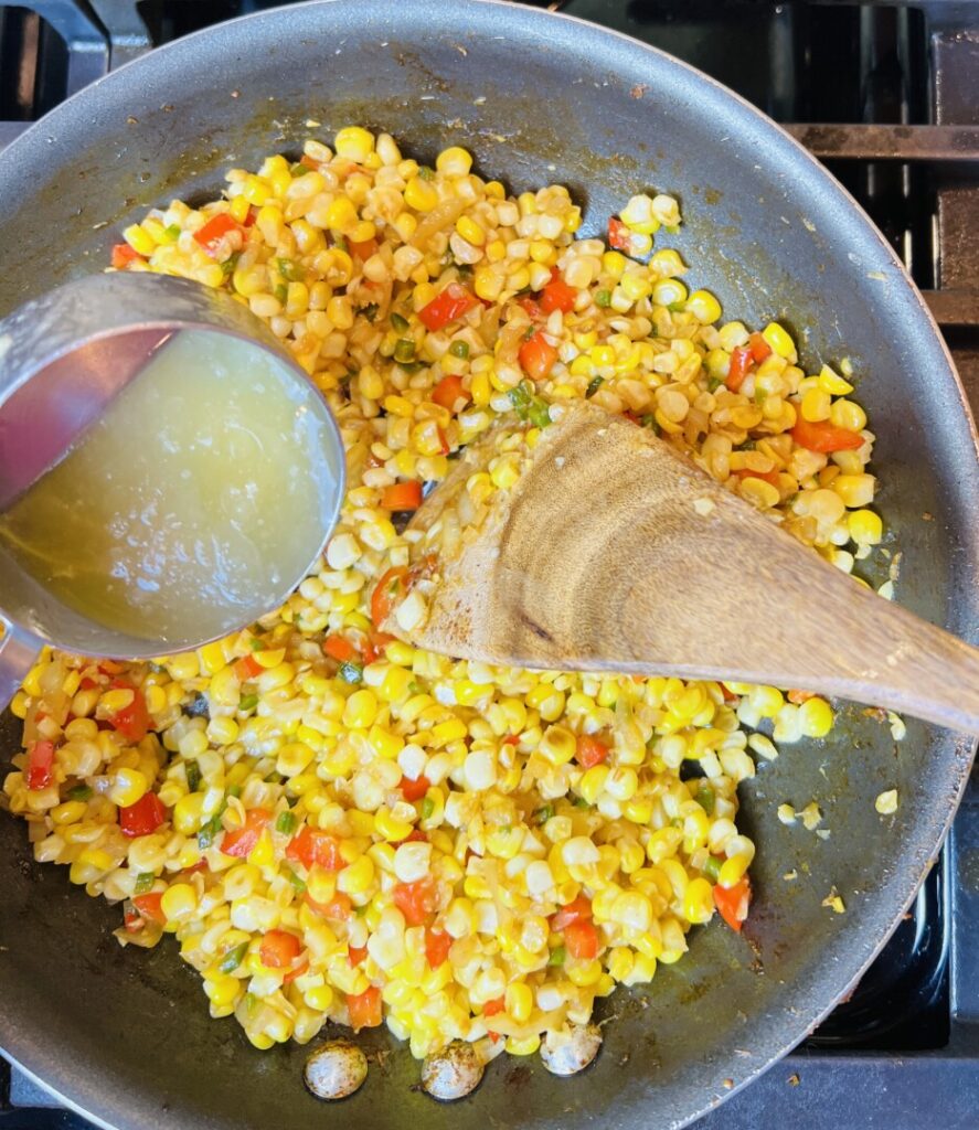 - Return the corn kernels to the pan and stir to combine them with the vegetables.