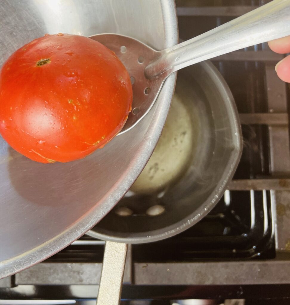 - Use a slotted spoon to lower the tomato into the boiling water and blanch for about 10 seconds, just long enough to loosen the skin but keep the tomato flesh raw.