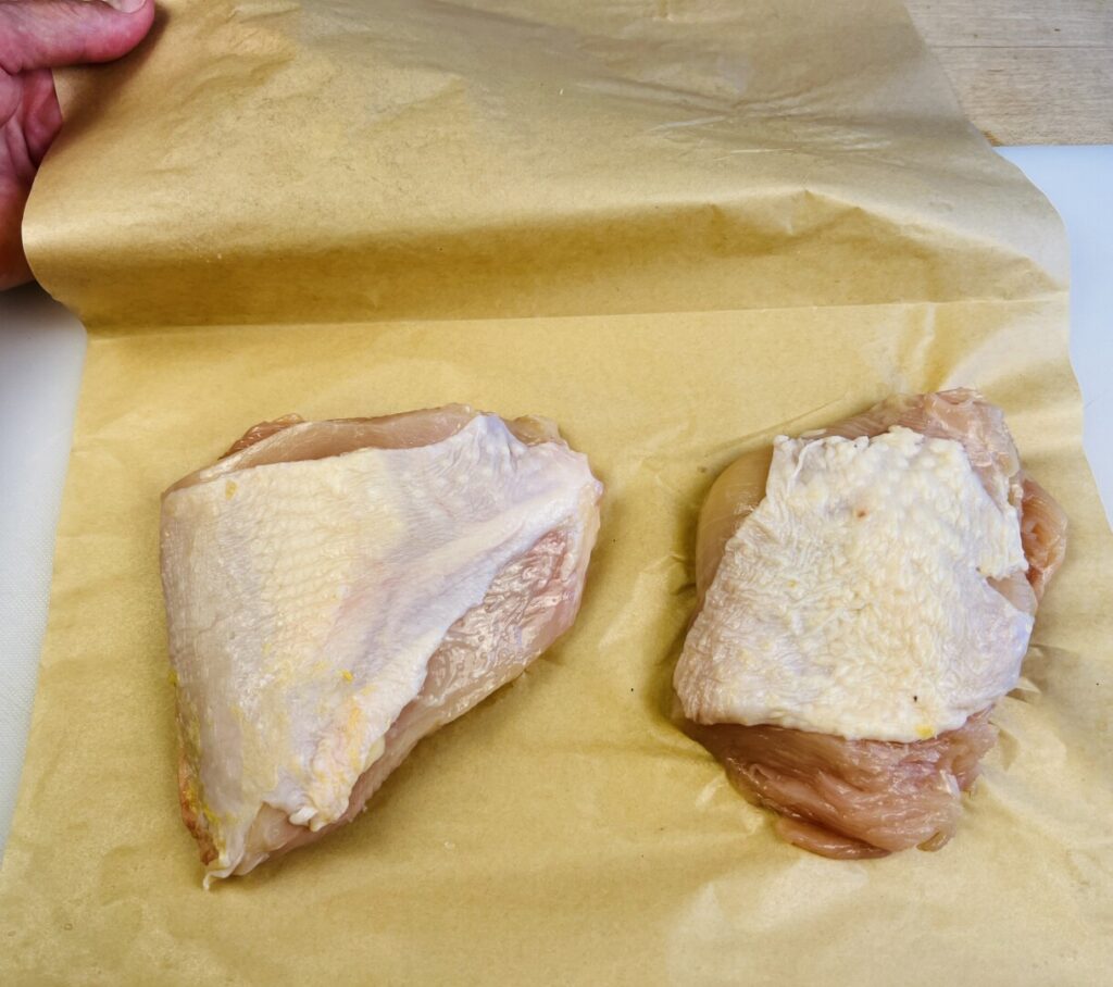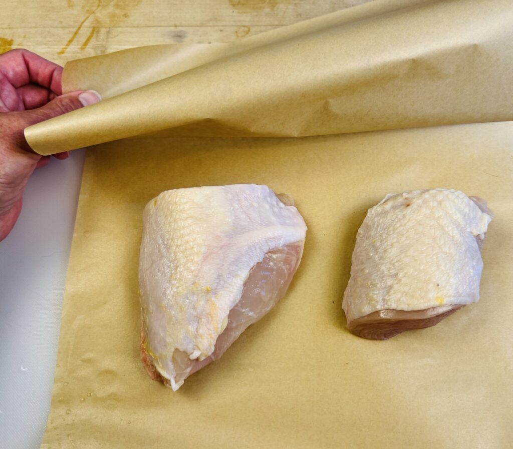 For even roasting, you’ll also need to equalize the thickness of the portions. Place the chicken breast pieces on one end of a sheet of parchment and fold the top of the sheet down over them. Use the smooth side of a meat mallet https://amzn.to/3W5ye7L (or the back of a small, sturdy sauté pan) to flatten the pieces to equal thickness.