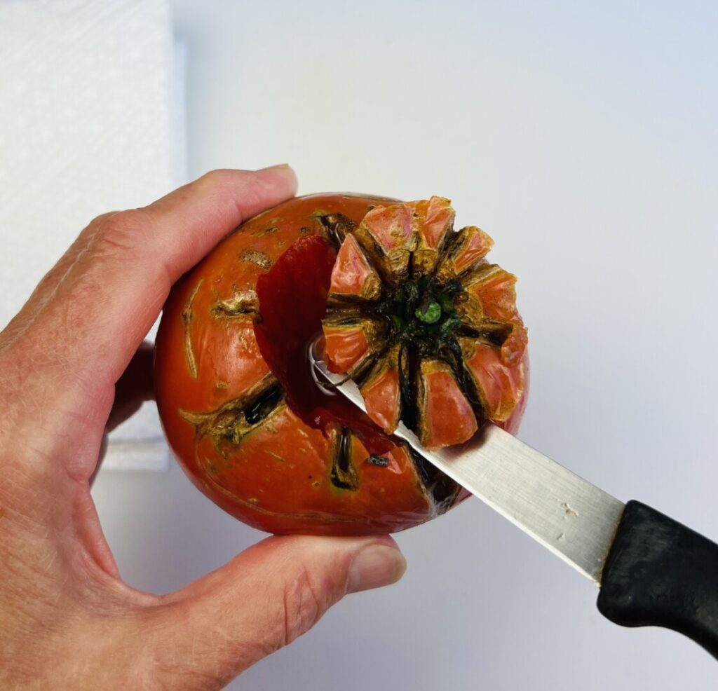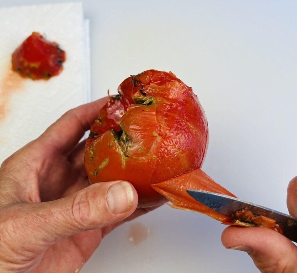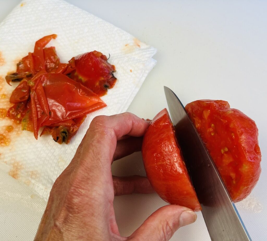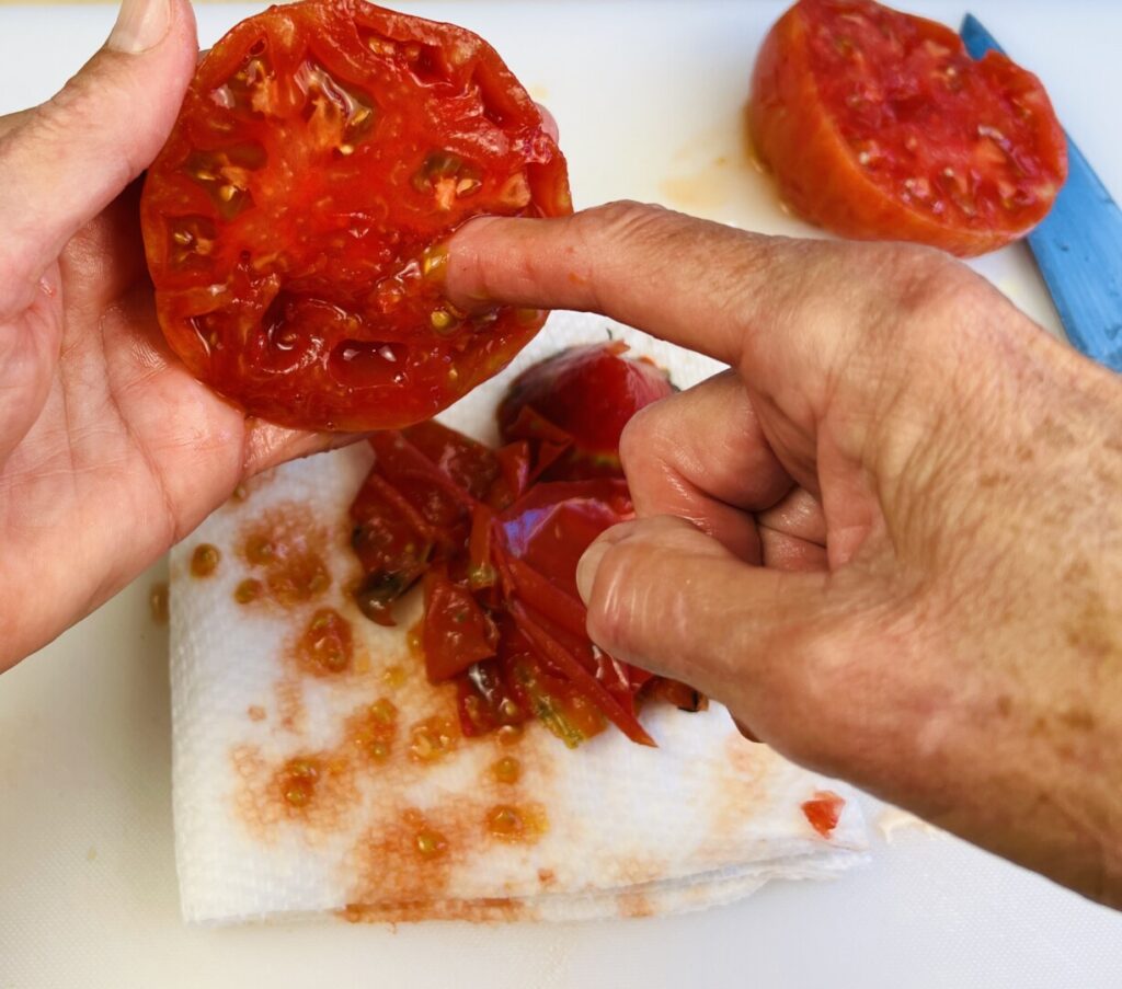 - Core the tomato, slip off the skin, and cut it in half widthwise. Use your fingers to remove most of the seeds.