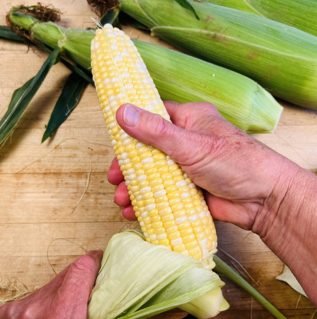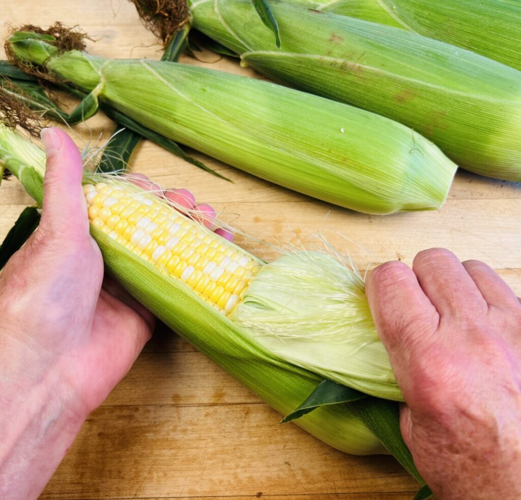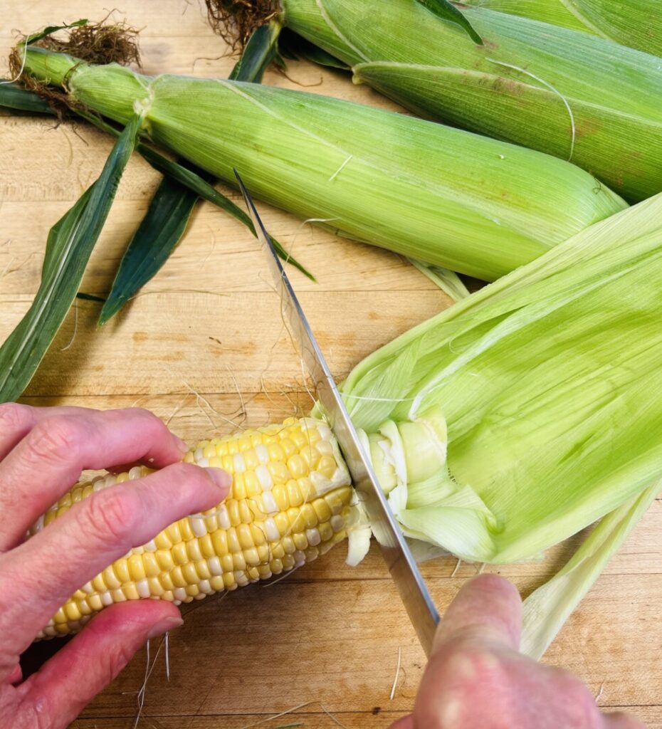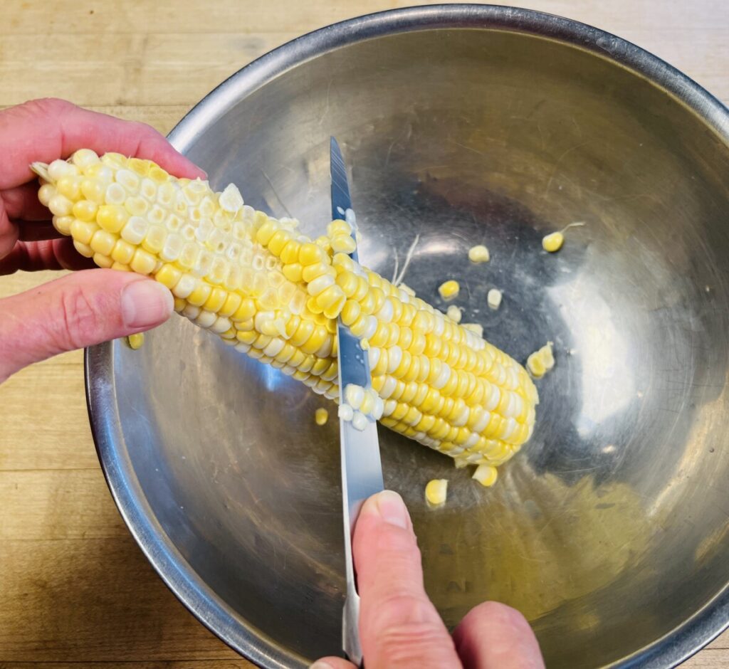 Shuck the corn and remove as much silk as possible. To efficiently remove the kernels from the cobs hold each ear pointed-end-up with the base in a stainless steel bowl, and slice downward with a sharp, flexible boning knife. Cut as close to the cob as possible to retain the milky liquid that make corn juicy.