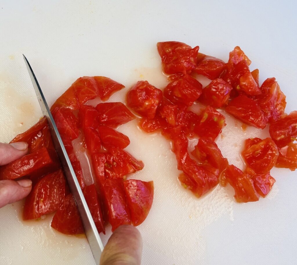 - Cut the tomato into rough dice a little larger than ¼ inch in size.